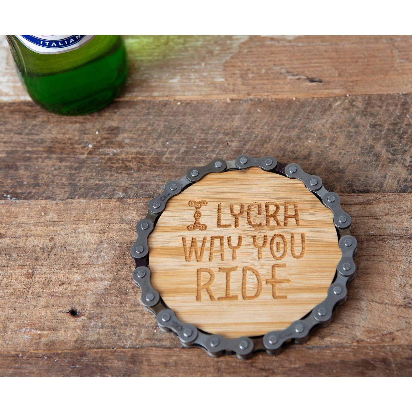 Love beer? Wheelie love cycling? Spread your love for bikes into your home with these fun and stylish cycling themed drinks coasters. Made from bamboo and real bike chain, and engraved with great cycling inspired quotes “Gears and beers” and “I lycra way you ride”, this set of two novelty coasters sit perfectly on any desk or coffee table in the home and make a cheeky cycling accessory even your partner can enjoy! Complete with brown leatherette cord and bicycle shaped swing tag, this set makes the perfect gift for a biking enthusiast oh their Birthday, Father’s Day or even as a Secret Santa at Christmas!