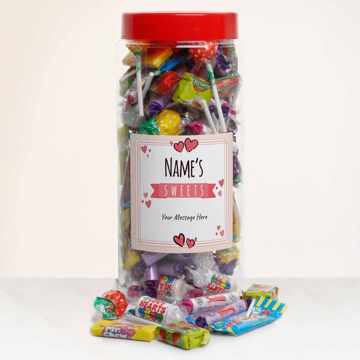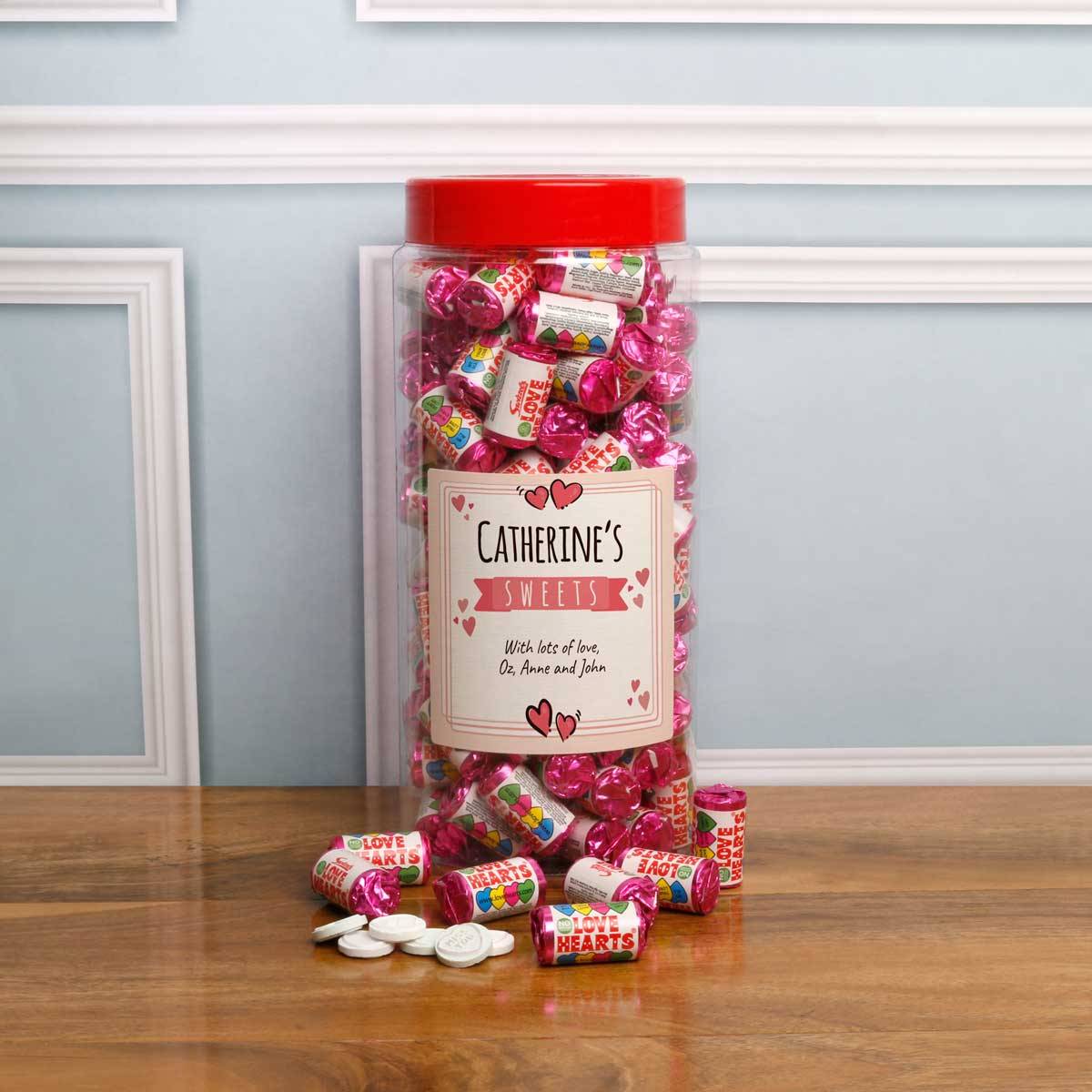 Packed full of Love Heart sweets, the jar's label is personalised with your recipient's name and your greeting.