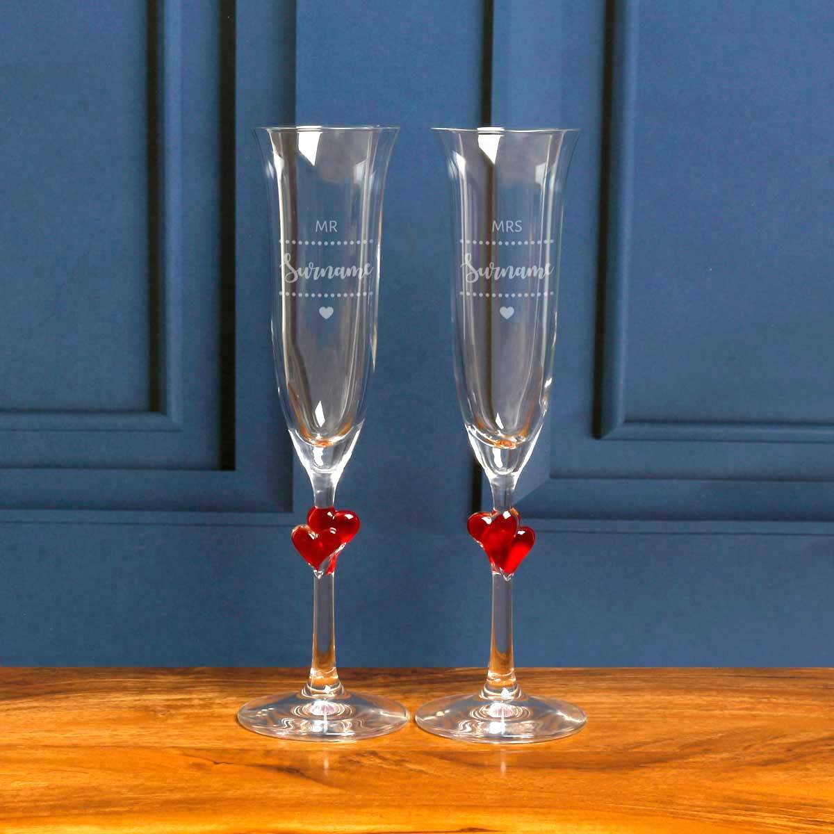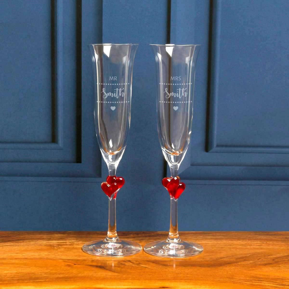 Mr And Mrs - Pair Of Personalised Red Hearts Champagne Flute
