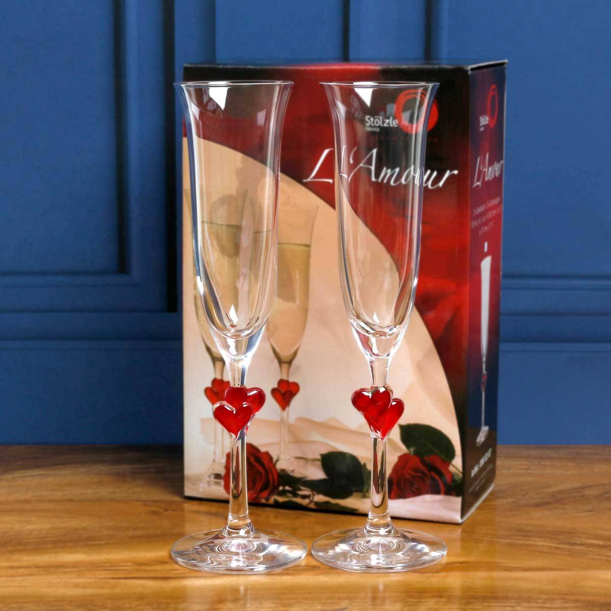 Toast the couple's new life together in style with two personalised crystal champagne flutes with heart stems. The price includes engraved personalisation.