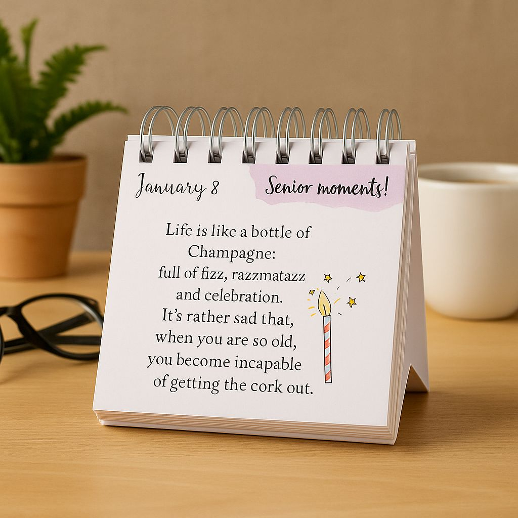 A fantastic birthday add-on gift! Senior moments, we all have them from time to time. This charming collection of anecdotes and lamentations will have your recipient chuckling along until you've forgotten what it was you were laughing at! The perfect present for a senior friend or loved one with a good sense of humour. Send this gift at any time of the year, the reader can start on the current date on this flipbook and continue to re-use for many years.