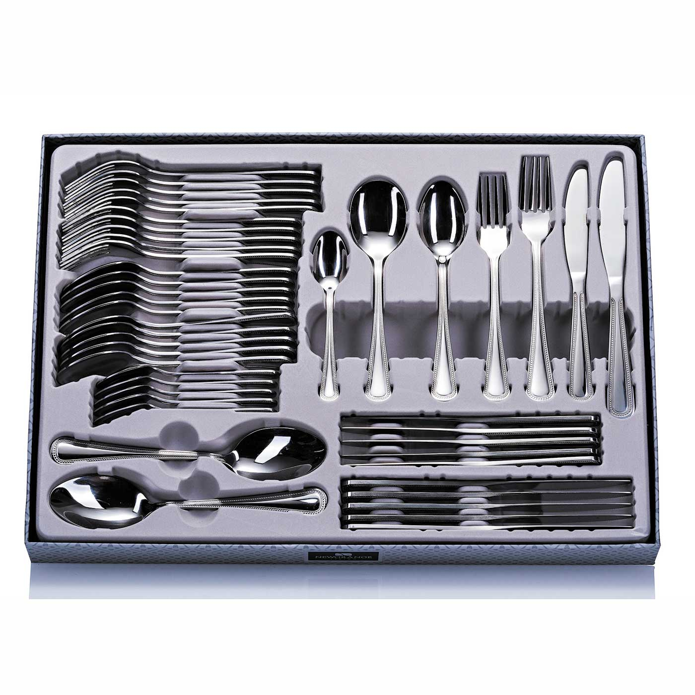 Consisting of 6 Table Knives, 6 Table Forks, 2 Serving Spoons, 6 Dessert Knives, 6 Dessert Forks, 6 Dessert Spoons, 6 Soup Spoons, 6 Teaspoons