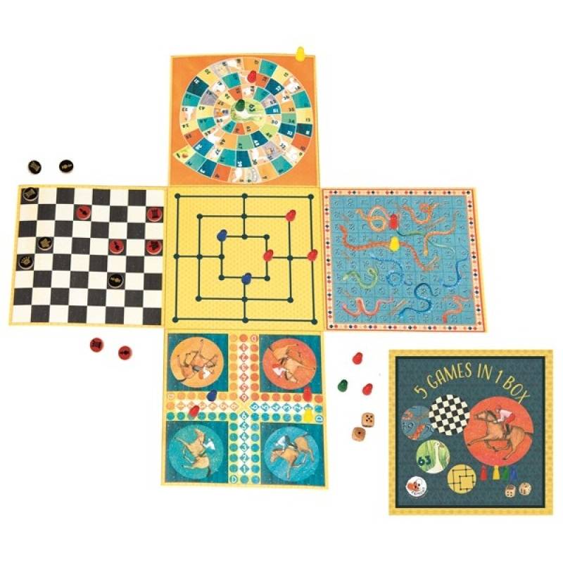 5 games in one box: chess, game of the goose, ludo, Morris men and Snakes and Ladders.