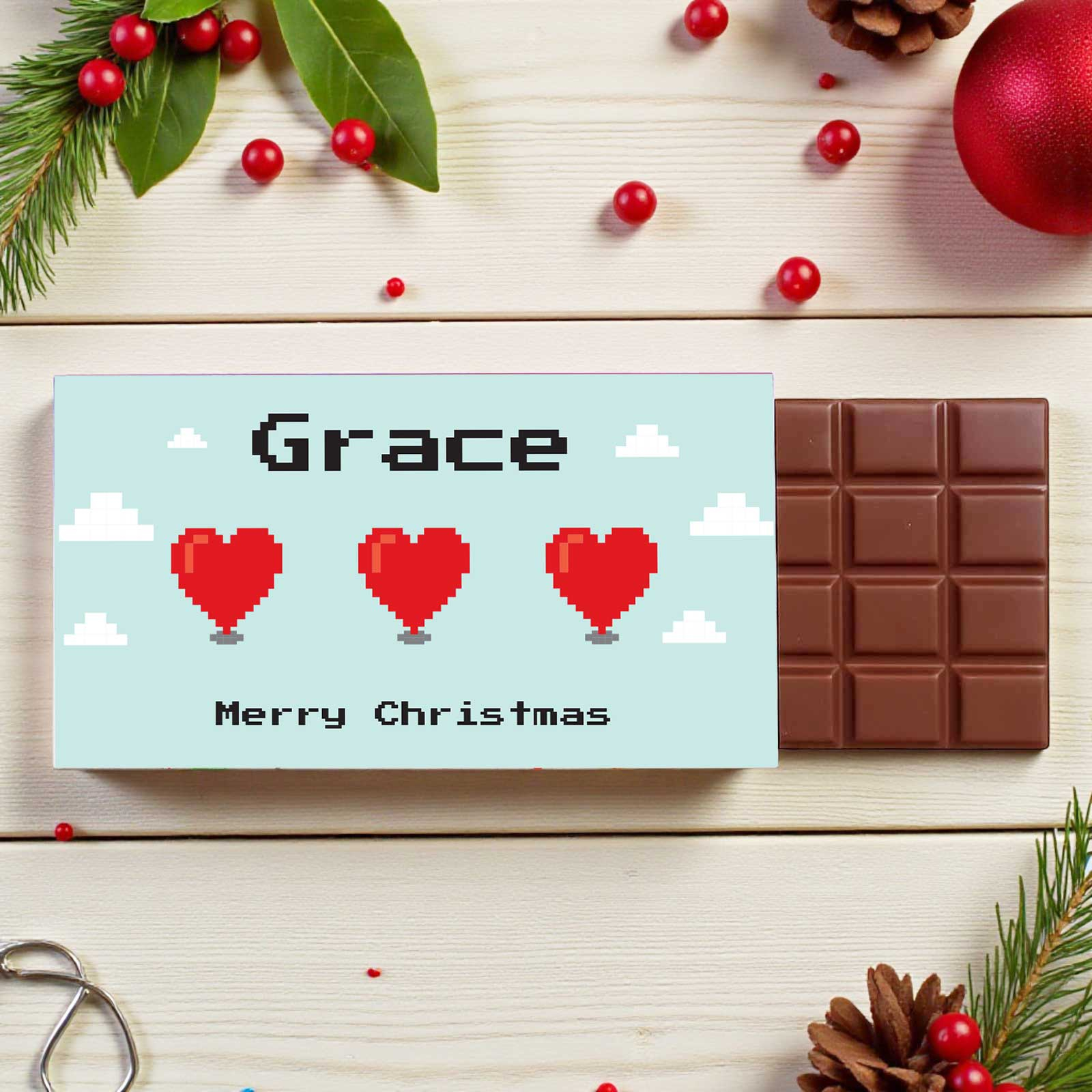 Delight the gamer, romantic, or chocolate lover in your life with our 8 Bit Heart Personalised Chocolate Bar 90g. This unique gift combines the nostalgia of retro 8-bit pixel art with the rich taste of premium Irish luxury milk chocolate, making it a truly special treat.