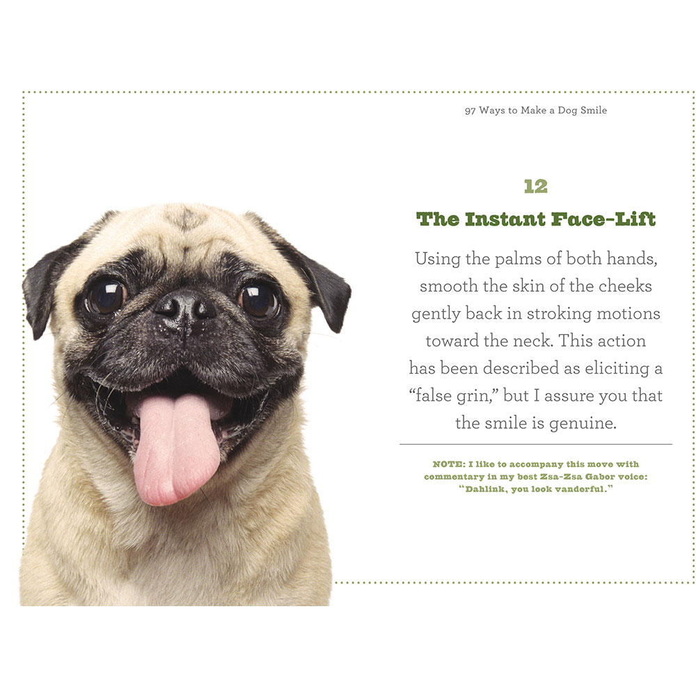 Explore playful massage moves like the Instant Face-Lift, discover the joy of low-calorie treat games, or simply enjoy the infectious smiles captured in every photo. This book is a treasure trove of inspiration to ensure every dog smiles—from the joyful wag of a tail to a beaming, happy grin.
