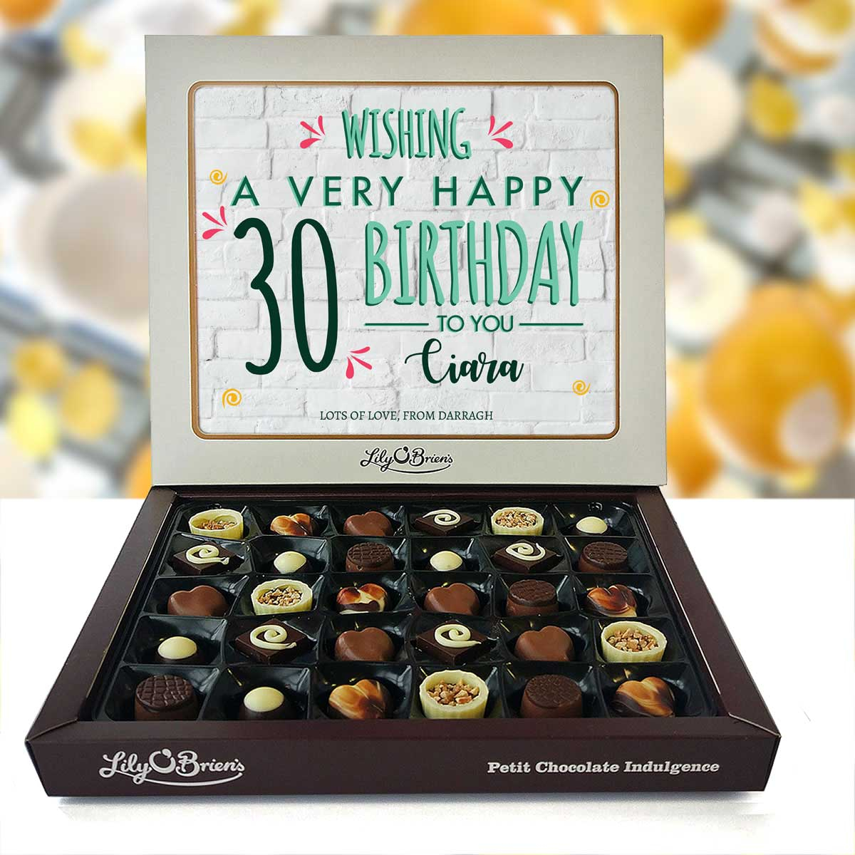 This Personalised Chocolate Box is filled with the Lily O'Brien's Luxury Chocolate collection. Approximate box dimensions: 290mm x 240mm x 40mm.