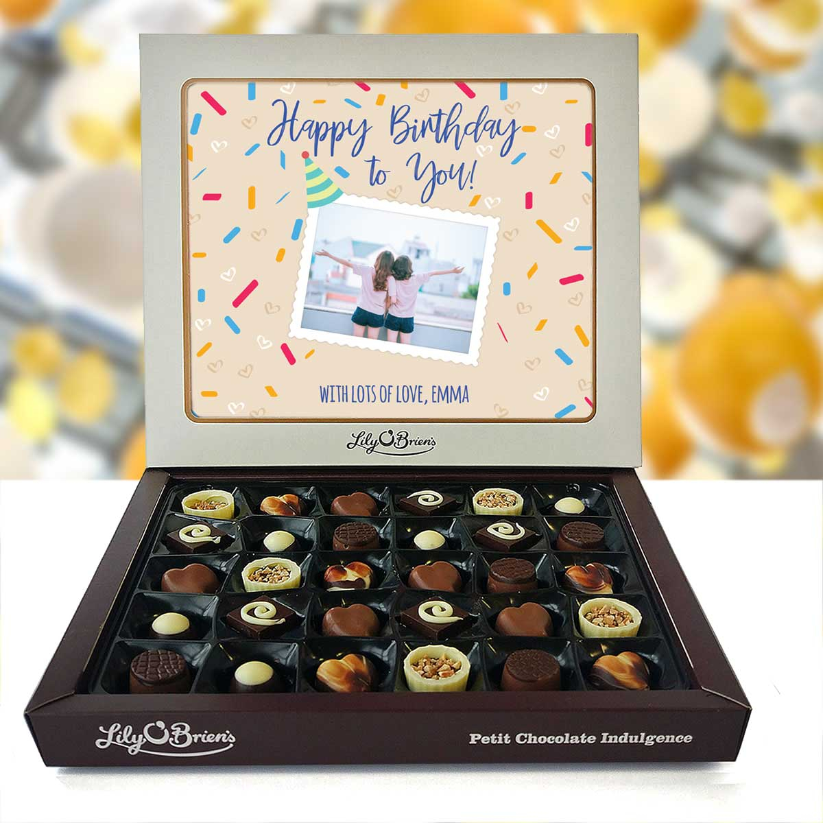 This Personalised Chocolate Box is filled with the Lily O'Brien's Luxury Chocolate collection. Approximate box dimensions: 290mm x 240mm x 40mm.