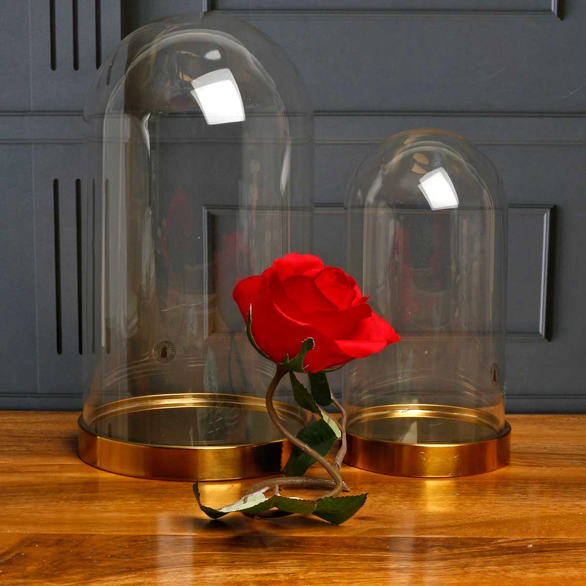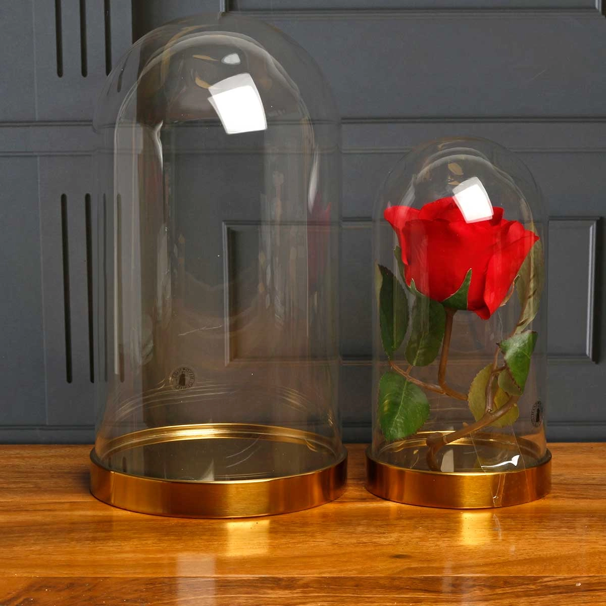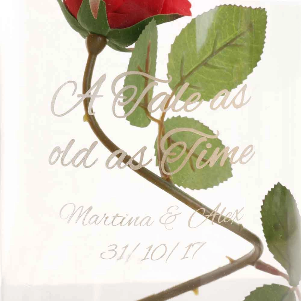 The Glass Cloche is engraved and contains an artificial red rose. This gift will look wonderful in any room.