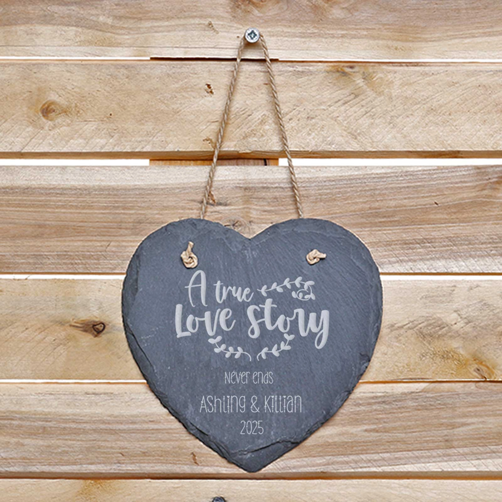 Celebrate your love with this beautifully crafted heart-shaped slate sign. Measuring 15.3 cm x 15.3 cm and complete with a rustic twine hanger, it's a perfect keepsake for weddings, anniversaries, or special moments. Personalise it with any three lines of text – a heartfelt message, names, and a meaningful date – to create a truly unique and sentimental gift.Material: Slate and Twine