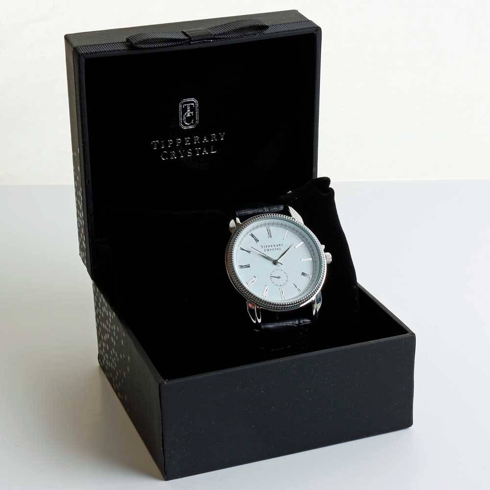 Accurate Men's Watch. Tipperary Crystal introduces a model with a boldly distinctive design, notably featuring silver plated casing around a white face with elegant hands that sweep across the watch face, providing an understated display of the hours and minutes. Each watch has a twelve month warranty.
