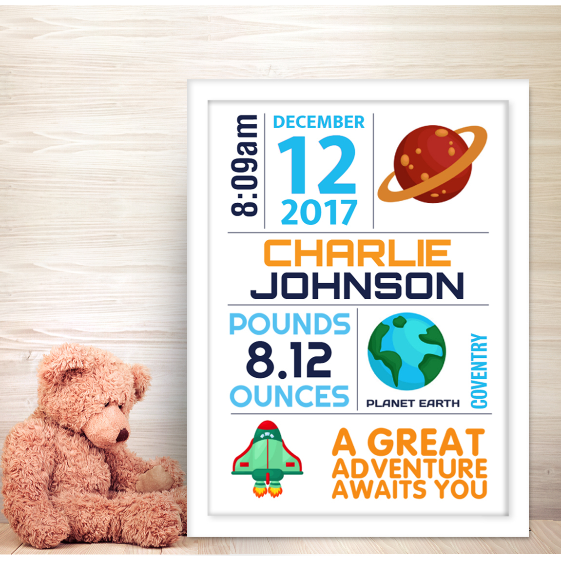 A beautiful gift for any new baby that will look fantastic in their nursury! The print contains Baby's date of birth, full name, time of birth,  weight and place of birth.