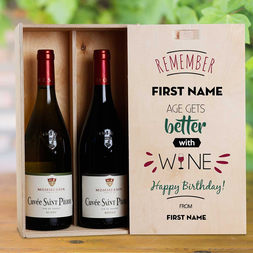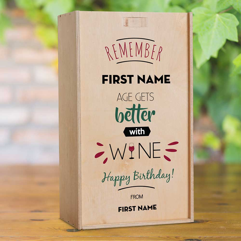 This personalised wine box with two bottles of win makes the perfect gift for any wine drinker on their birthday.