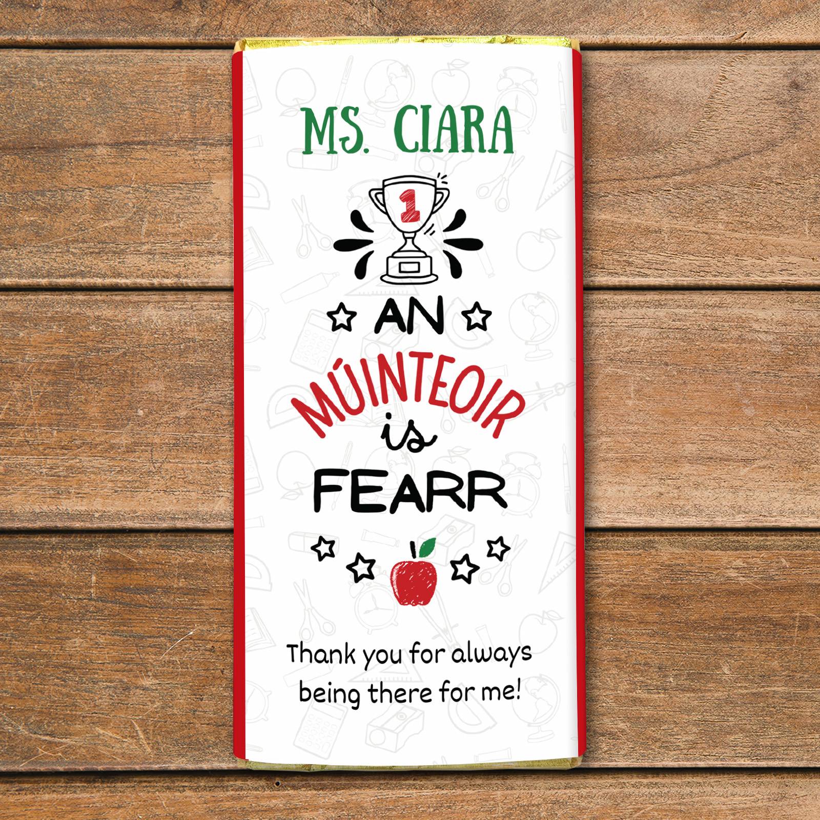 Our personalised chocolate bars make great gifts and are guaranteed to put a smile on your teacher's face. AN MÚINTEOIR IS FEARR (translates as The Best Teacher).