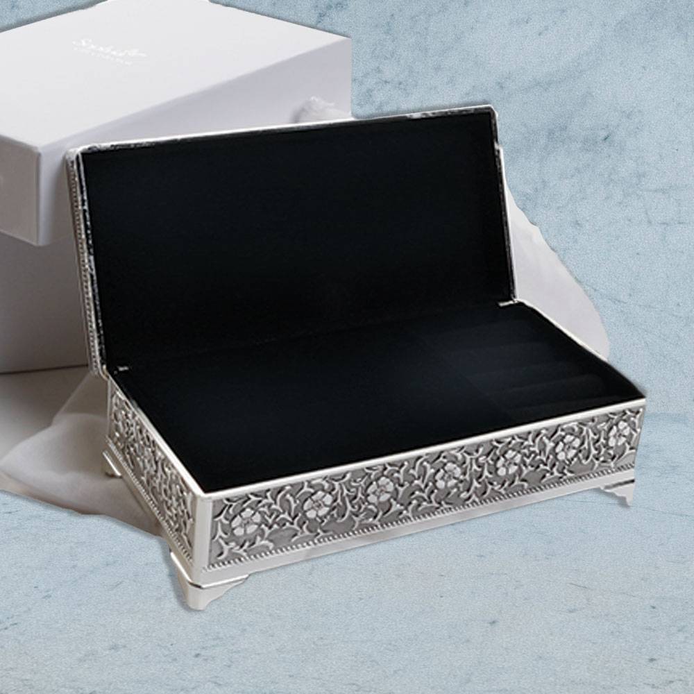 The lid is hinged. Trinket is lined in a black flock fabric.