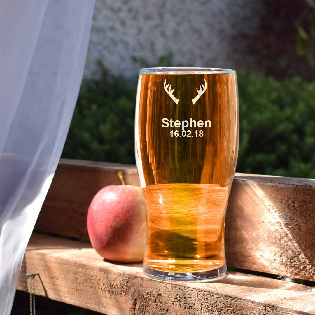 A personalised Pint glass with stag antlers.