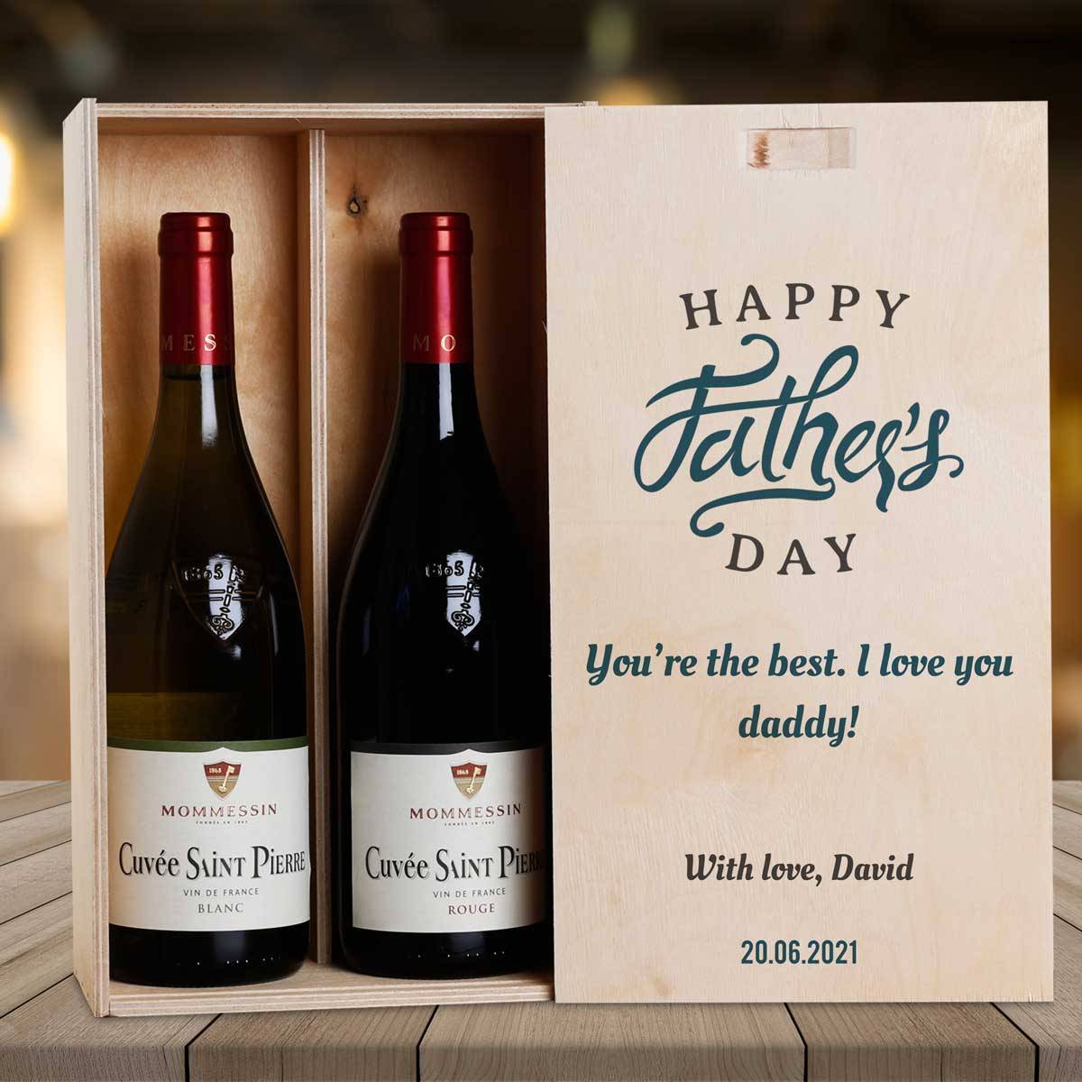 This personalised wine box with two bottles of wine makes the perfect gift for Father's Day.