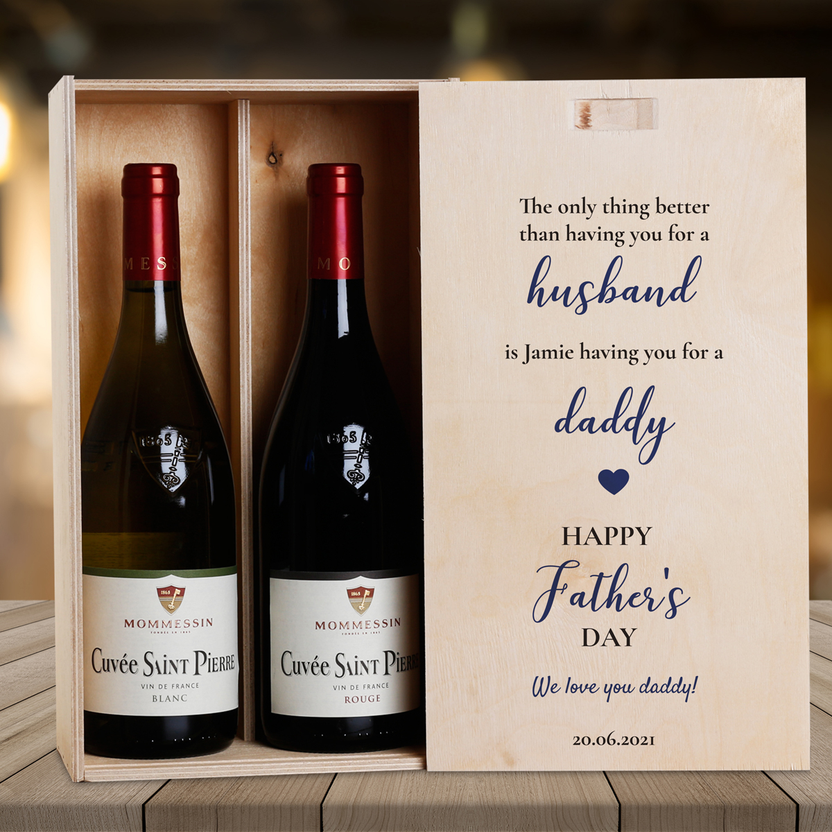This personalised wine box with two bottles of wine makes the perfect gift for Father's Day.