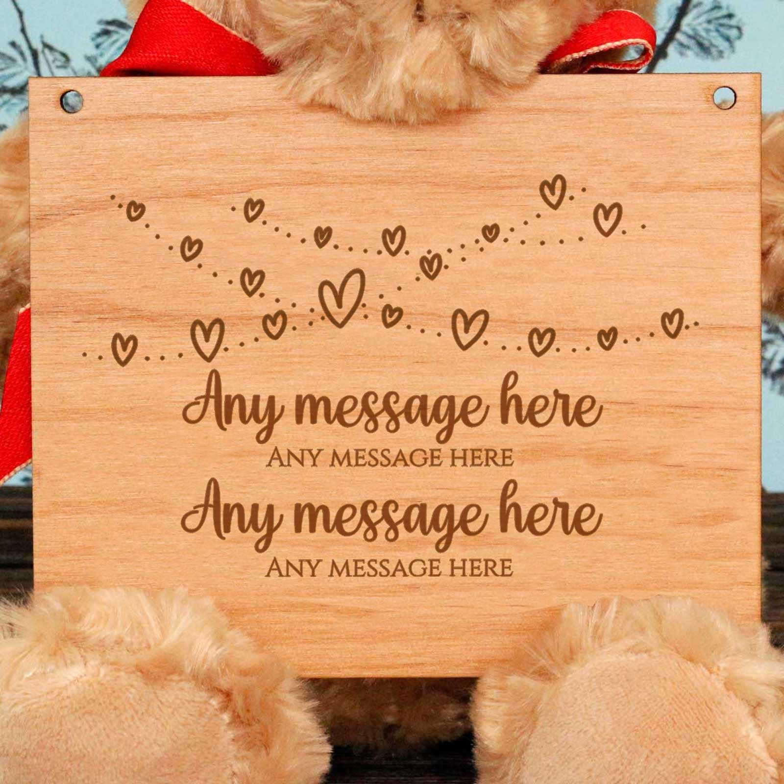 Celebrate special moments with the Any Message Hearts Design Wooden Plaque Personalised Teddy Bear. Add up to four lines of your own message, making it a truly unique and meaningful gift.