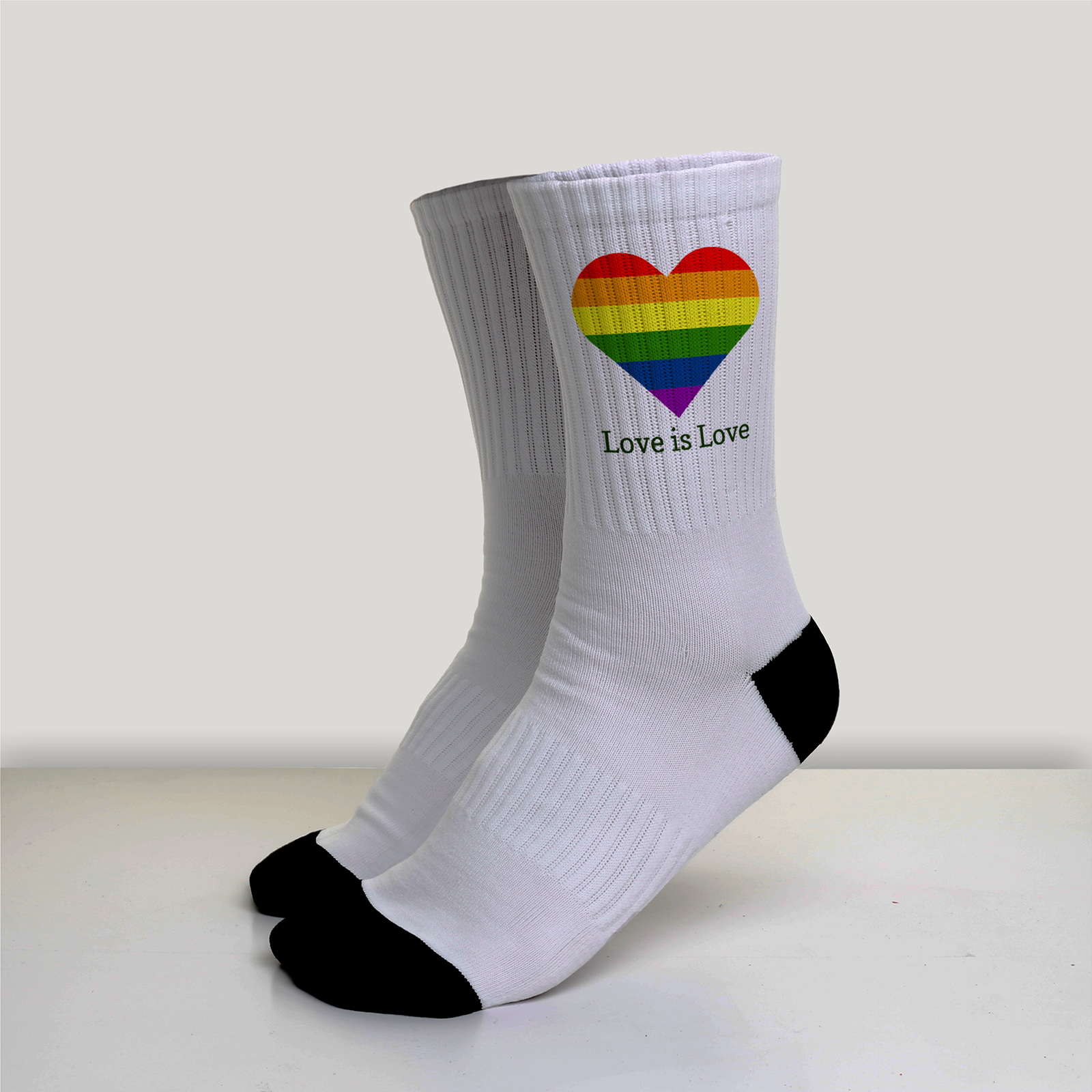 Celebrate LGBTQ+ pride with Any Message Rainbow Heart - Personalised Socks. These vibrant socks feature a customizable rainbow heart design, allowing you to add your own message or name. Show your support, express your individuality, and spread love and acceptance at pride parades and beyond with these stylish and meaningful socks.