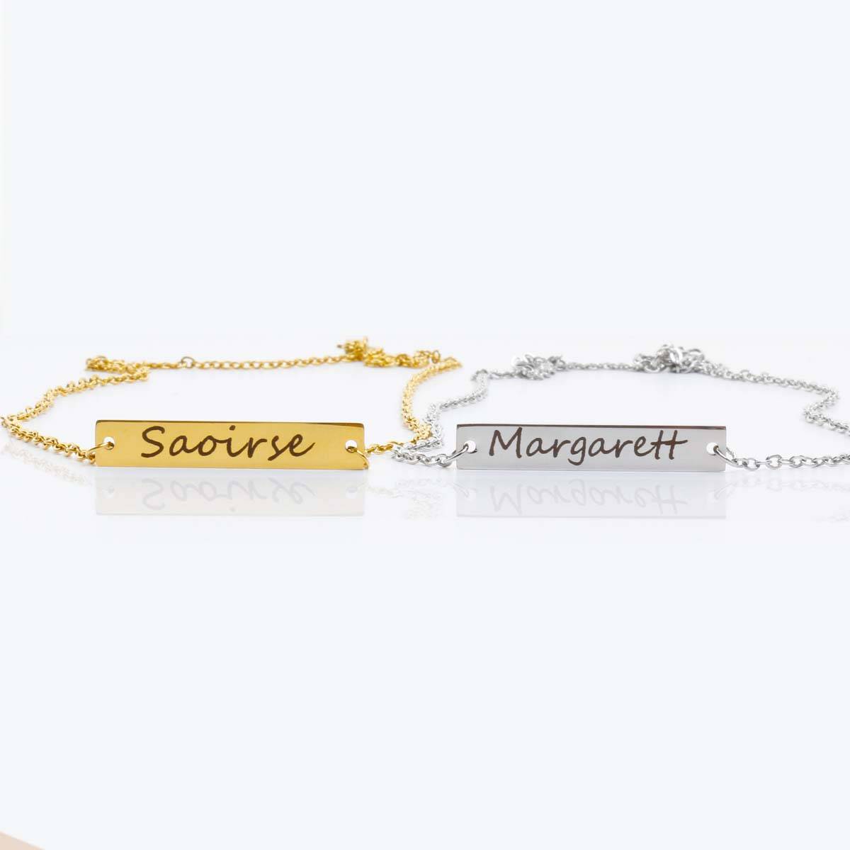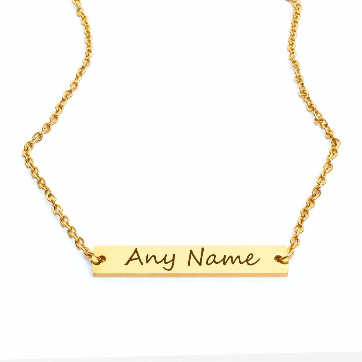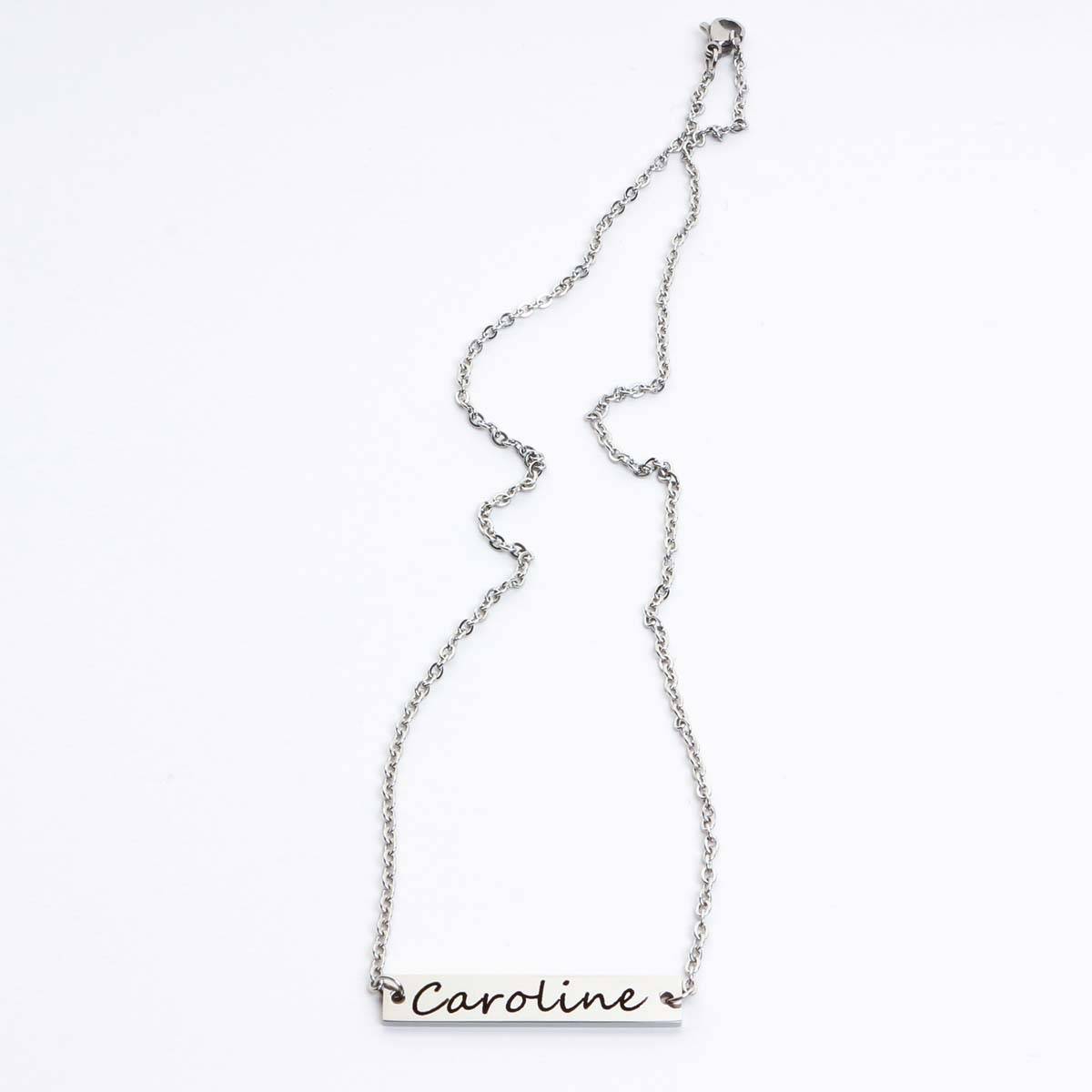 The Personalised Flat Bar Pendant hanging from a Box chain, makes the perfect accessory for any occasion.