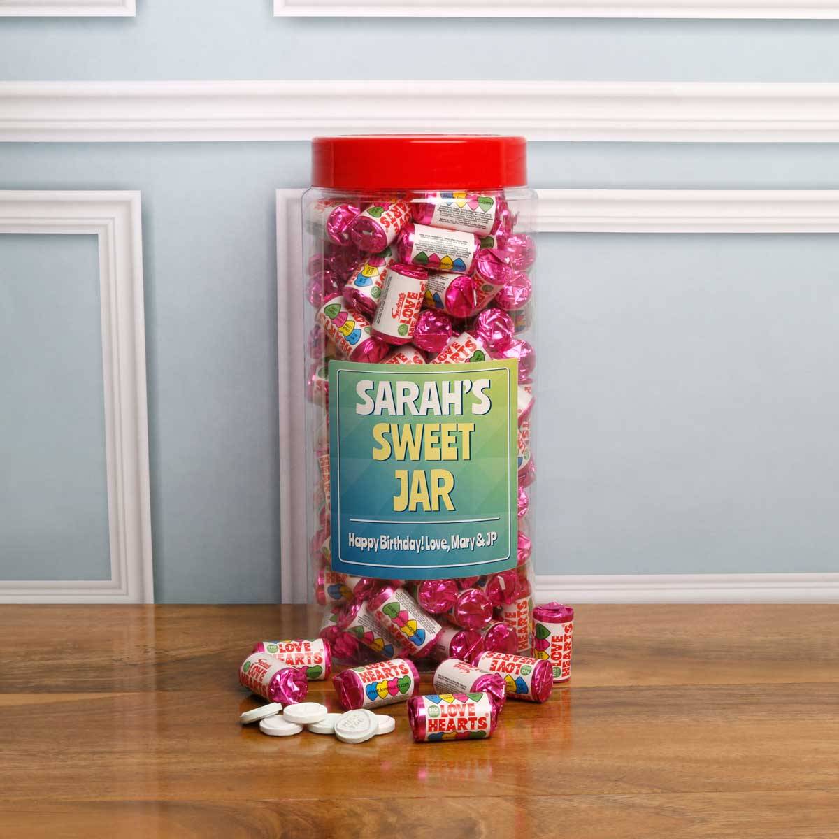 Packed full of Love Heart sweets, the jar's label is personalised with your recipient's name and your greeting.