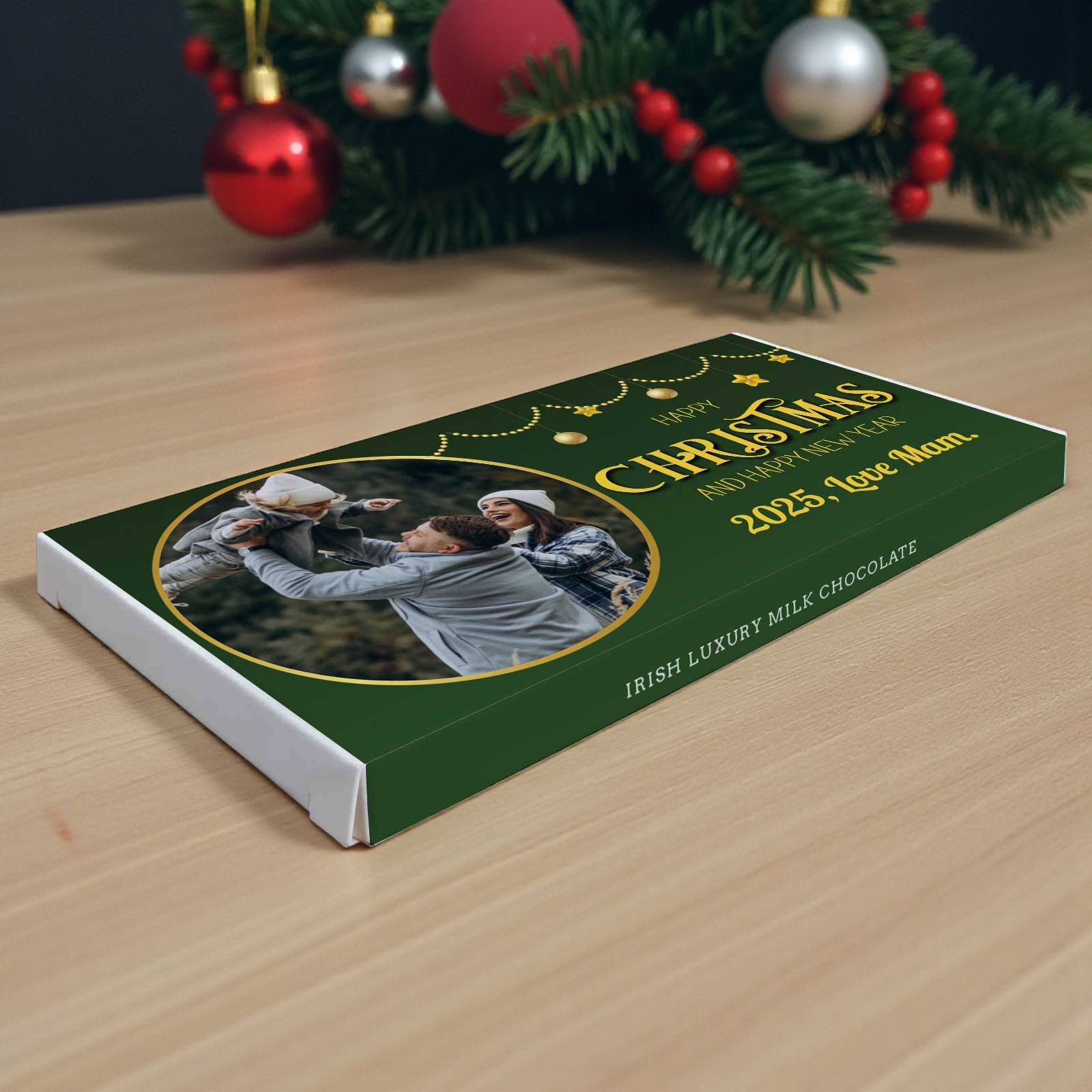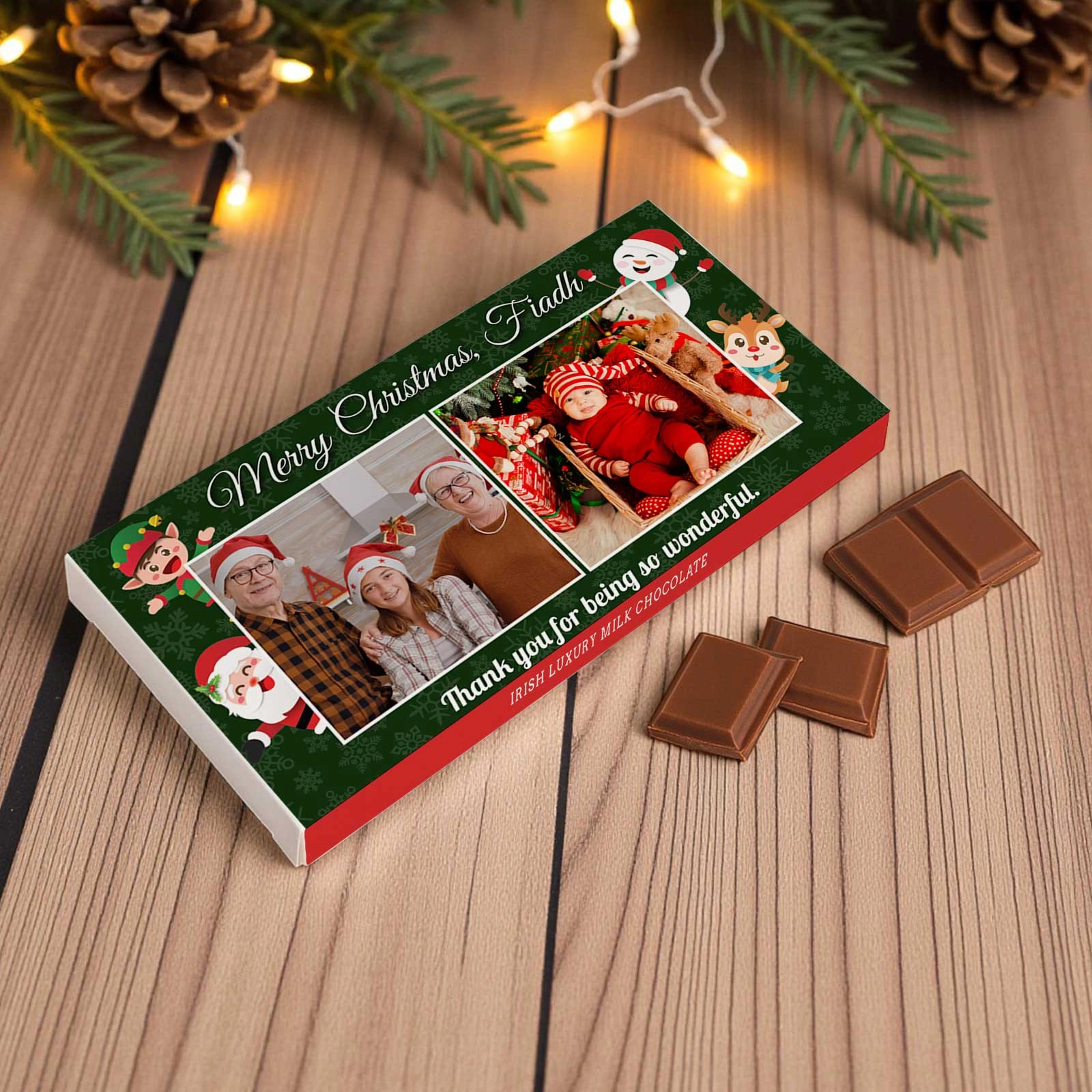 Celebrate the magic of Christmas by gifting a uniquely customised chocolate bar that combines rich Irish luxury milk chocolate with your own cherished photos and heartfelt Christmas message. This charming personalised gift is a wonderful way to spread festive joy and show your loved ones just how much you care.