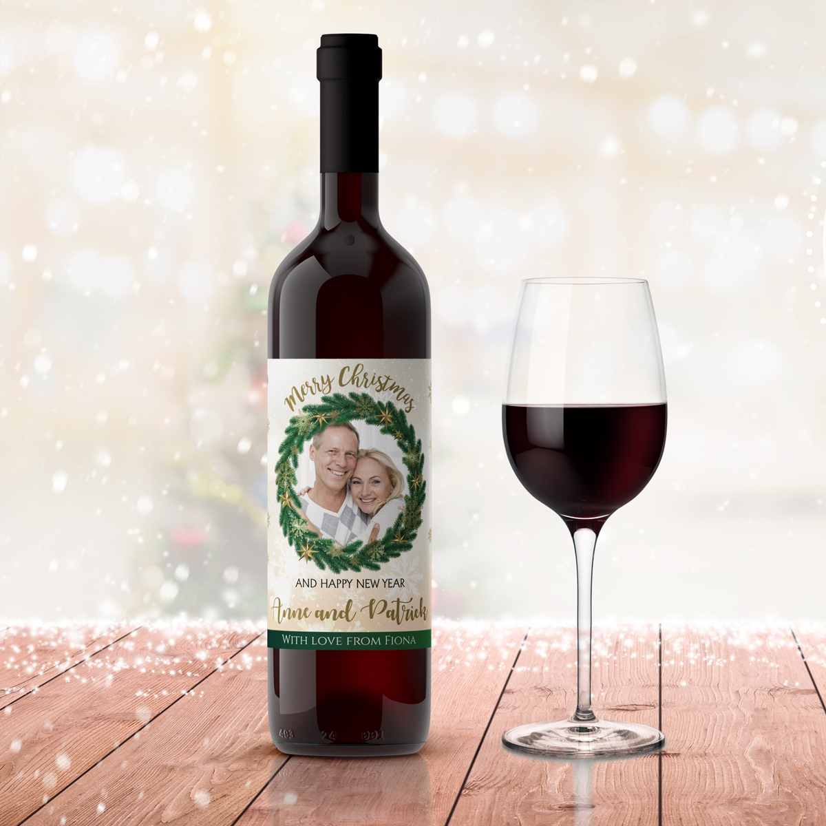 Any Photo Merry Christmas Wreath Personalised Wine