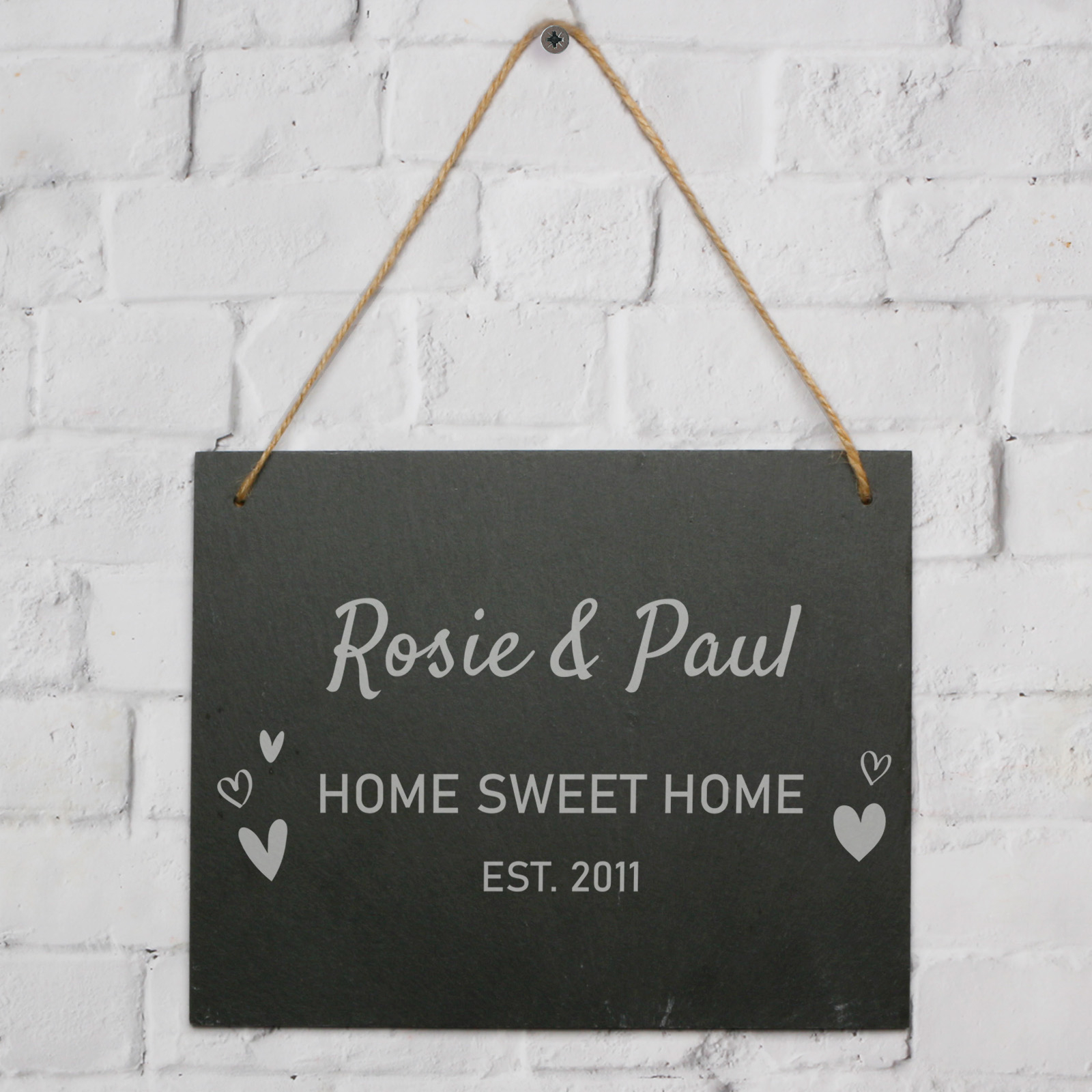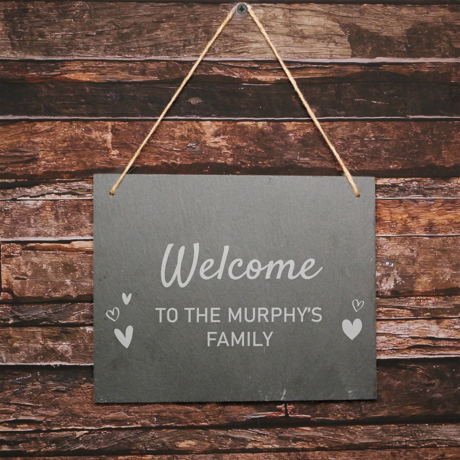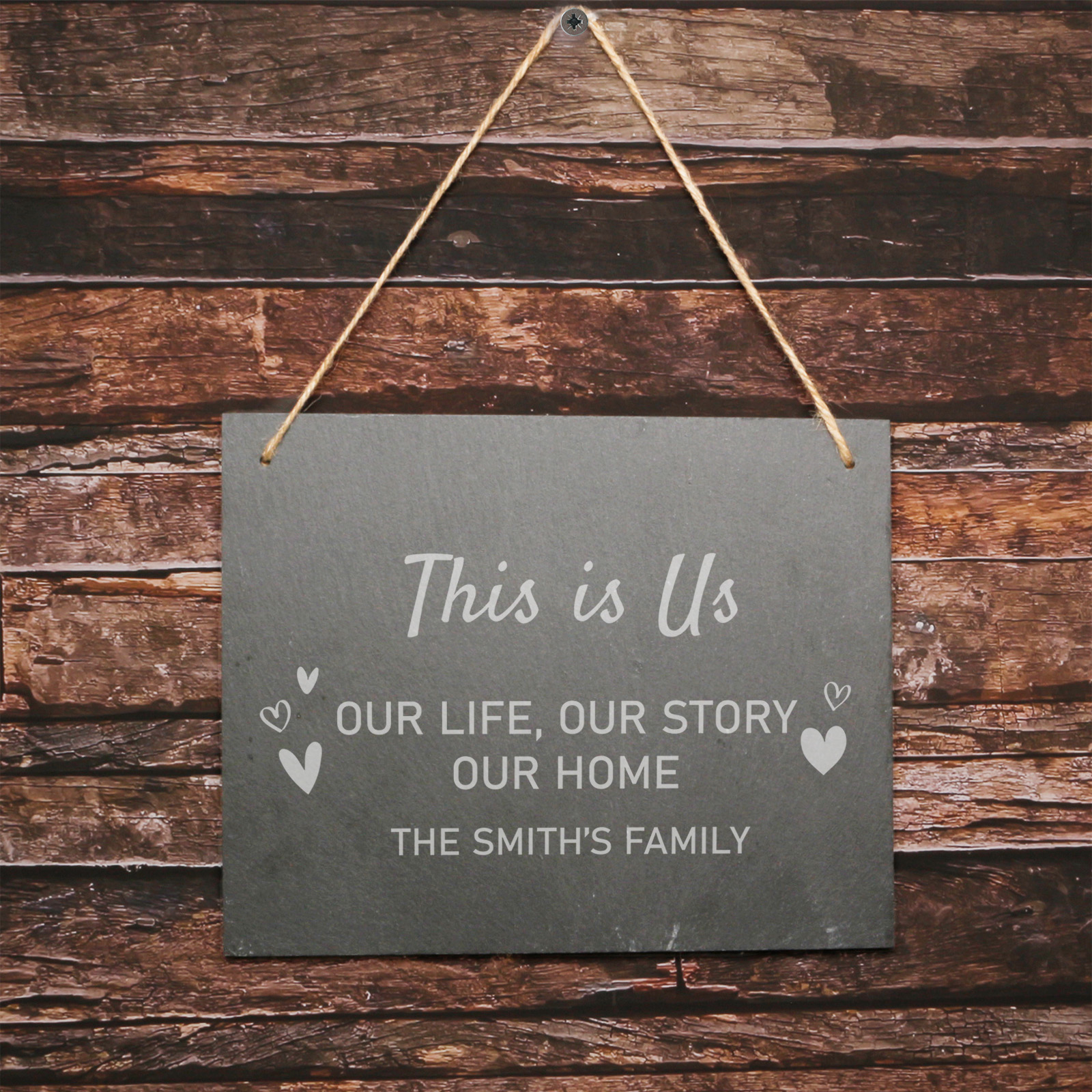 Any Text and Hearts - Personalised Large Hanging Slate - it's a beautifully crafted slate plaque adorned with hearts design, offering a touching tribute for any occasion. Customise Line 1, up to 30 characters, using a charming manuscript font, while Line 2 and 3 allow 30 characters each, elegantly displayed in a font without serif.