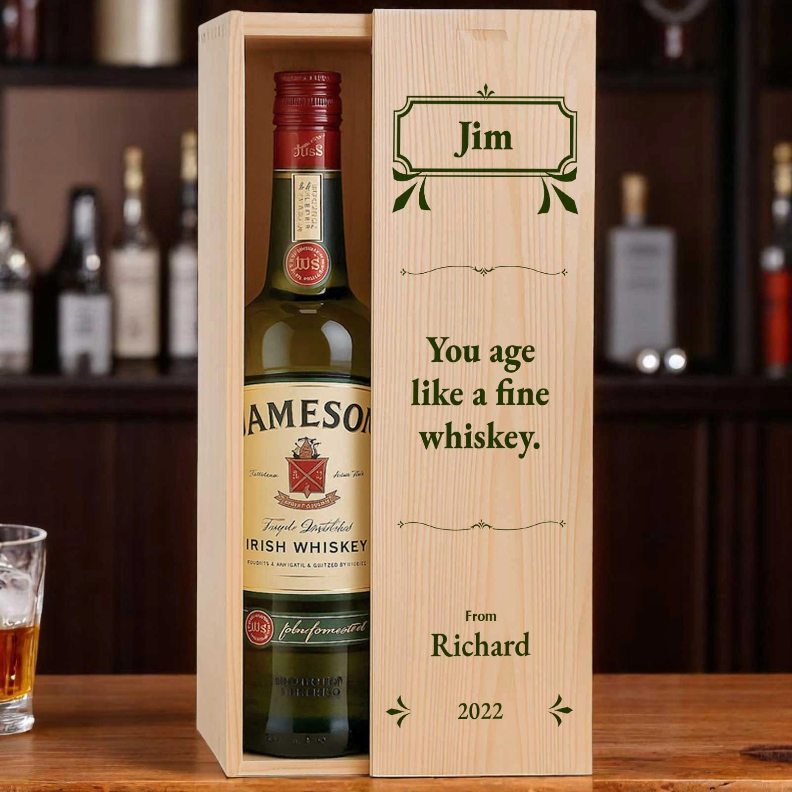 This personalised wooden box with a bottle of whiskey makes the perfect gift for any occasion.