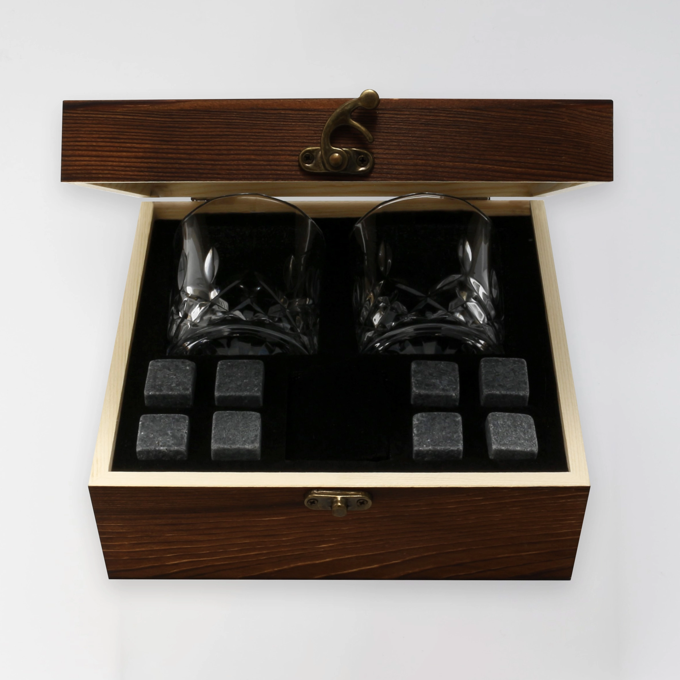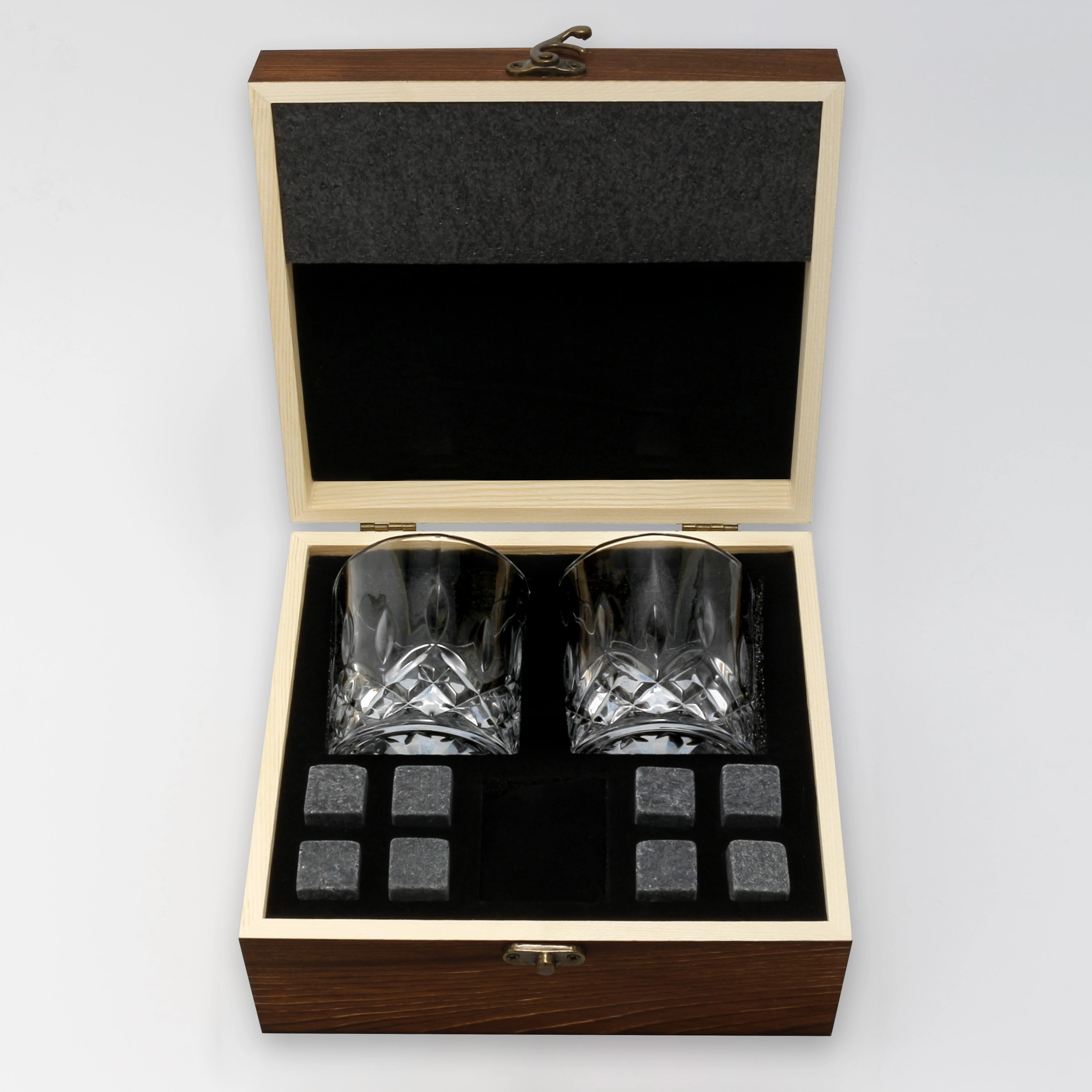 Wooden boxed Whiskey set comprising of 8 stones, Bag and 2 Whiskey Glasses.