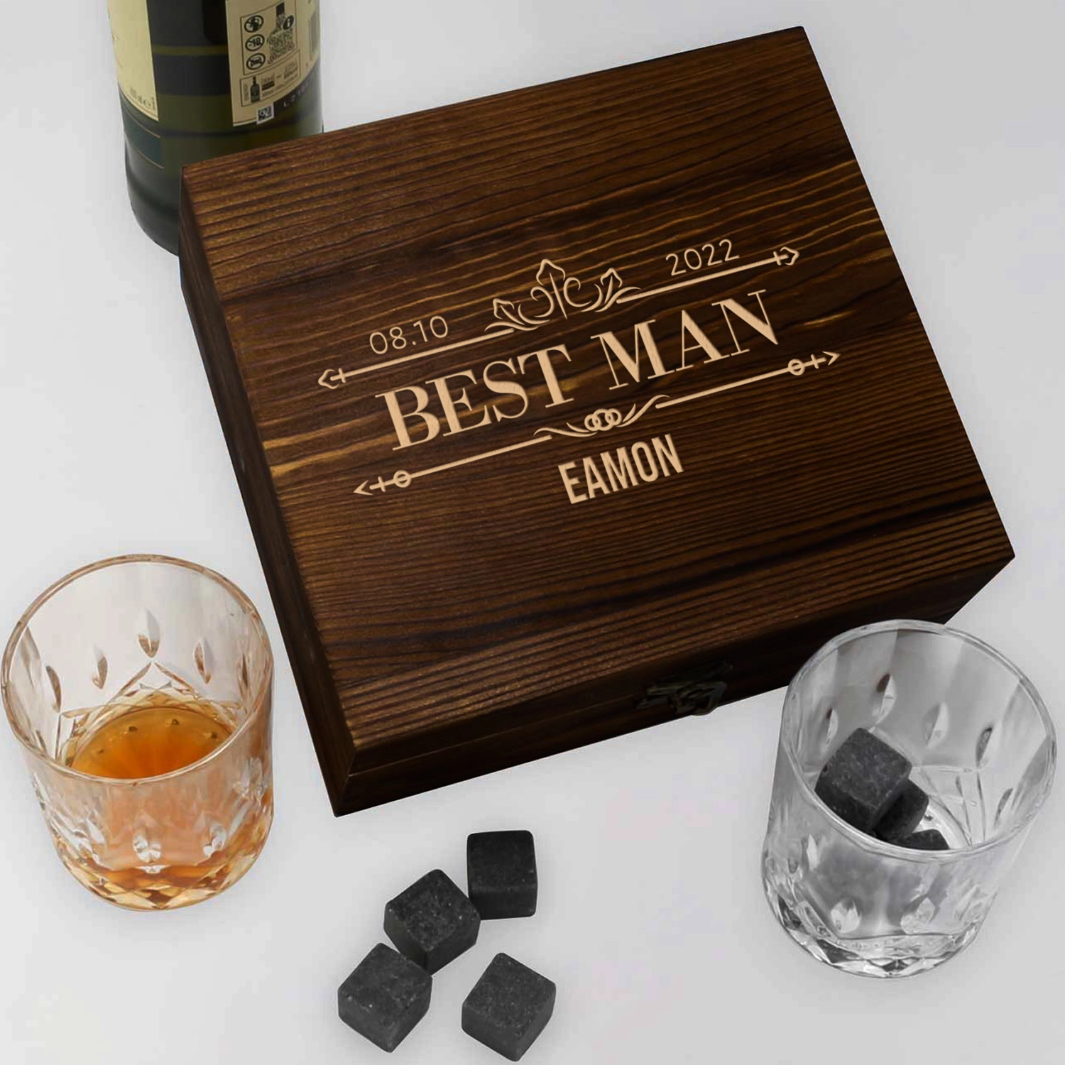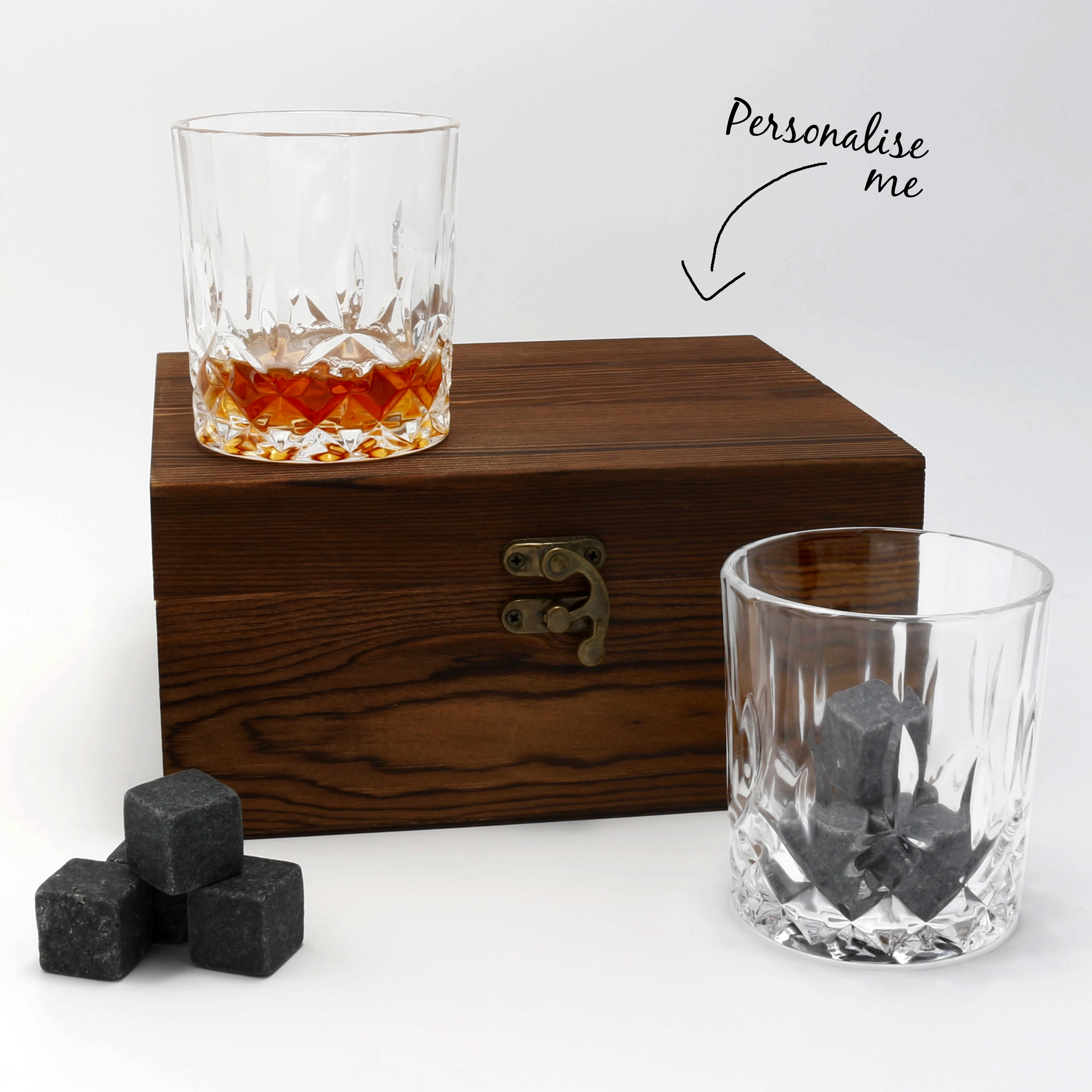PLEASE NOTE: The name is engraved on the wooden box only. No engraving is applied to the glasses.