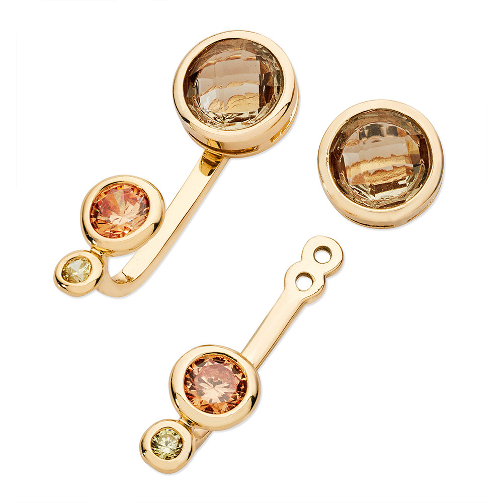 Autumn Jacket Earrings. These eye-catching earrings consist of three round cut crystals set in beautiful polished yellow gold. The largest round stud which is 5mm in diameter and is bronze in colour, can be worn alone or with the two round crystal jackets for an alternate and appealing look. They secure comfortably with push backs.