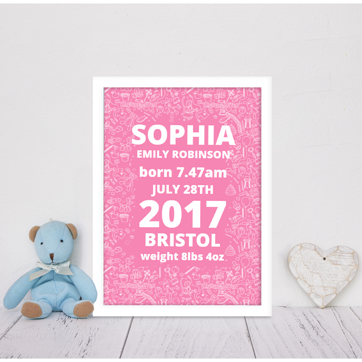 A beautiful gift for any new baby that will look fantastic in their new nursury! The print contains Baby's date of birth, full name, time of birth,  weight and place of birth.