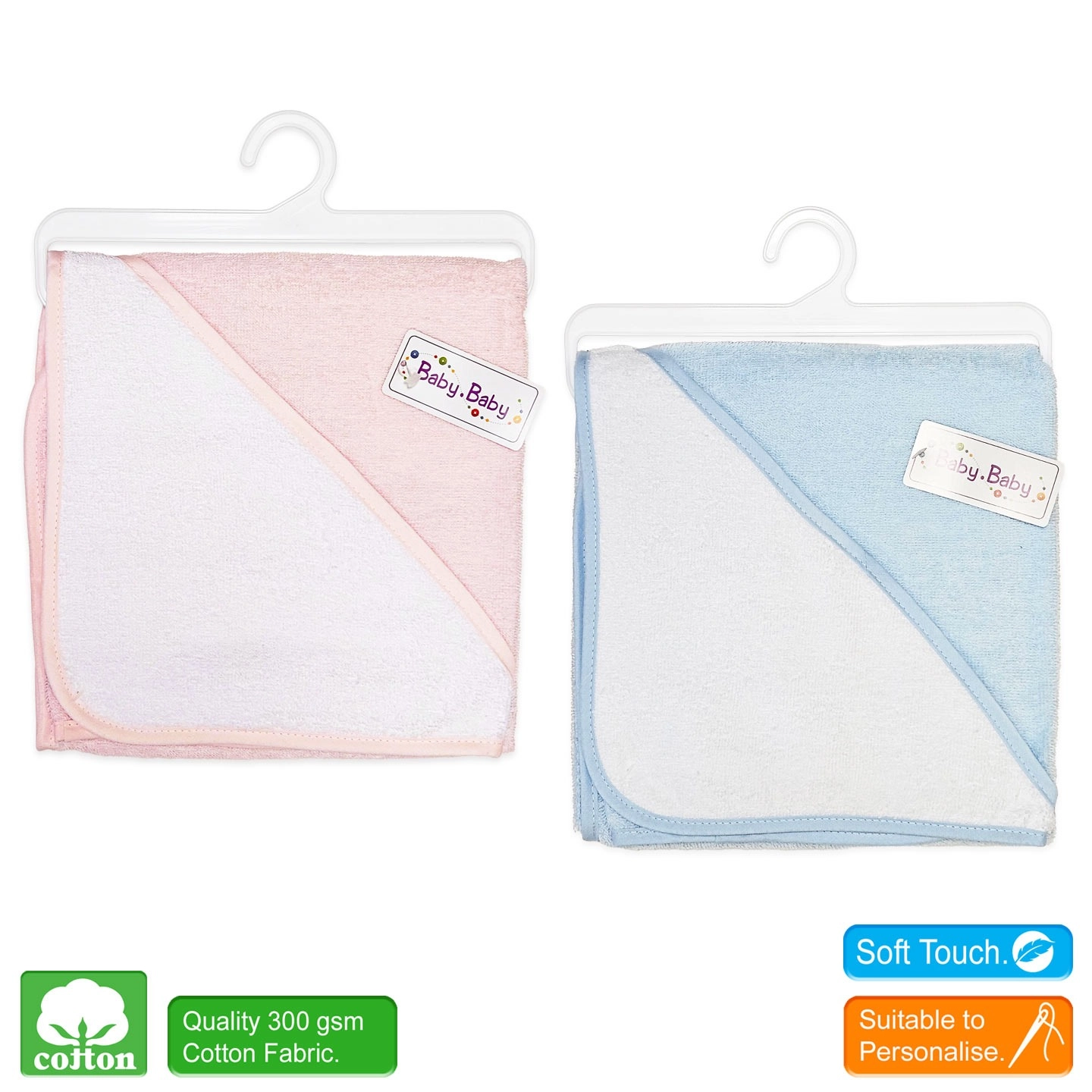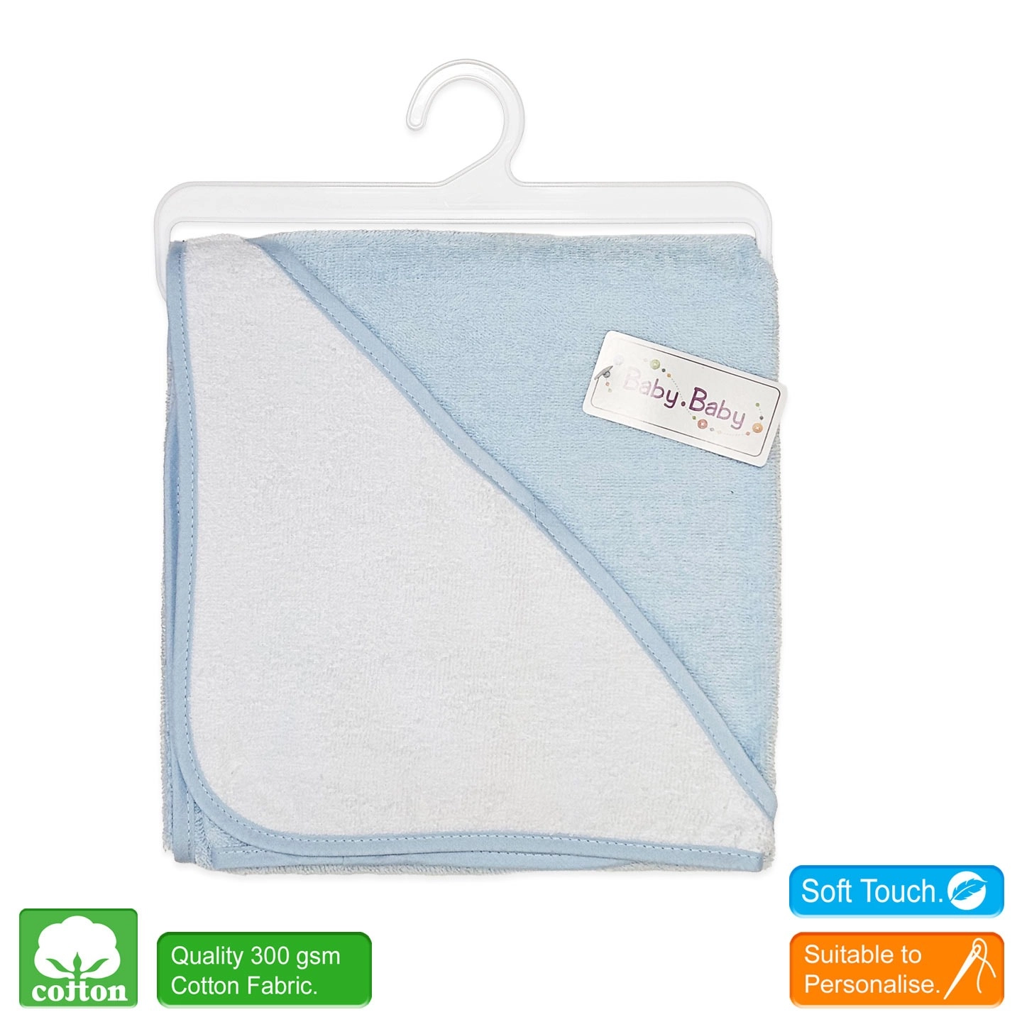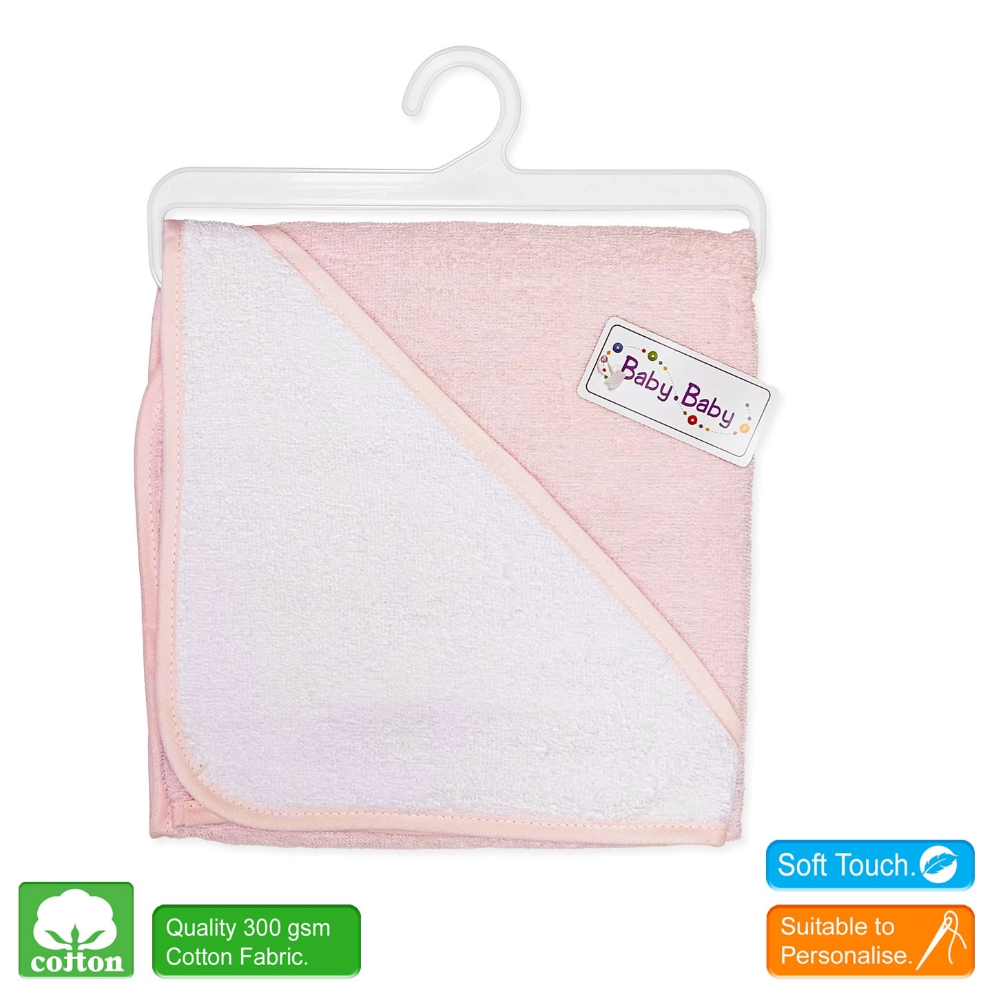 The generously sized 75 x 75 cm towel features a cosy, personalised-ready white hood to keep your baby snug and protected from the cold.