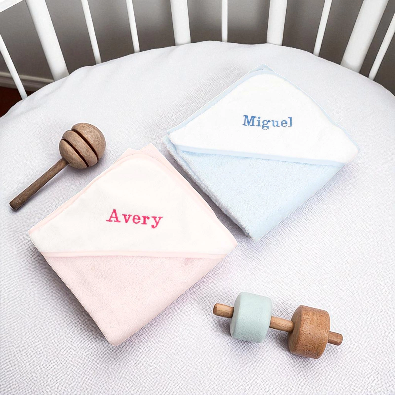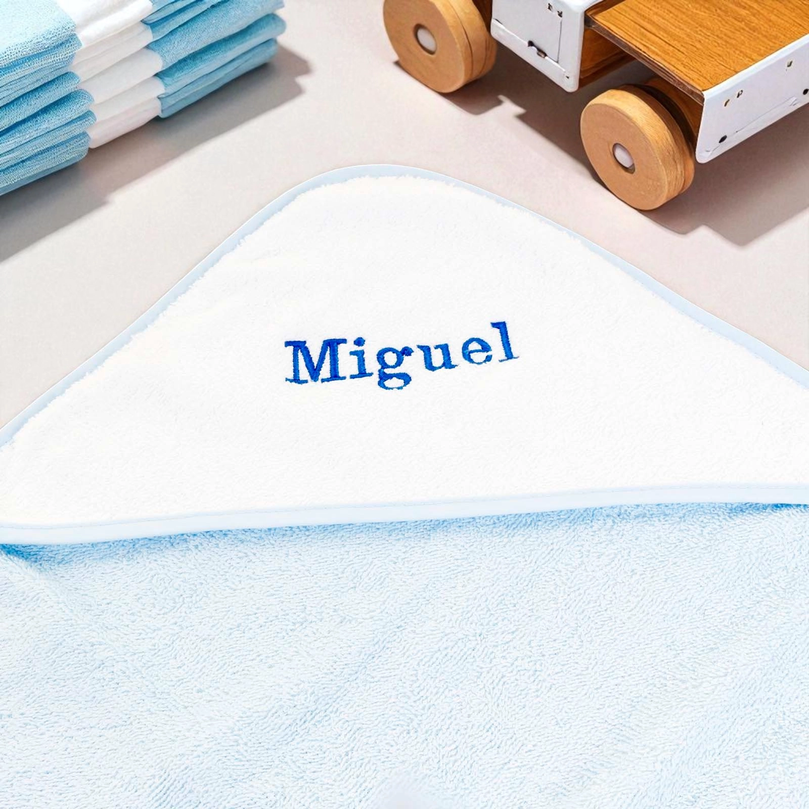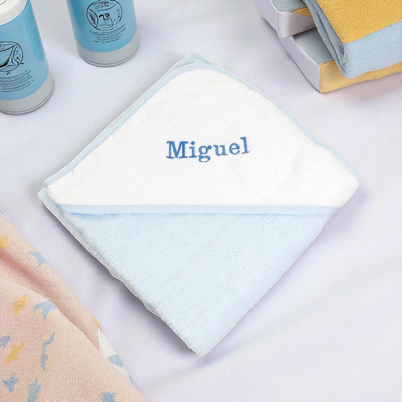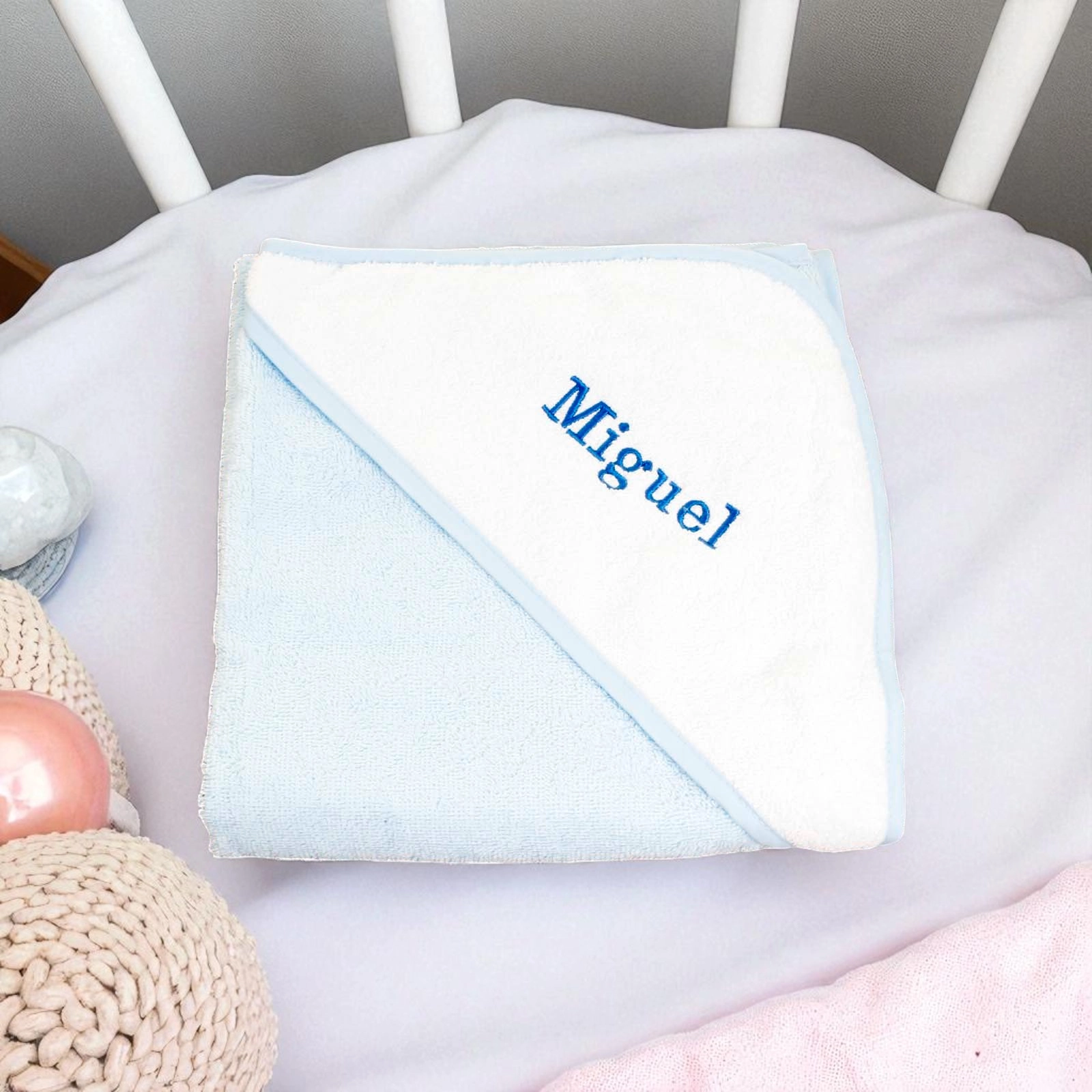 The generously sized 75 x 75 cm towel features a cosy, personalised-ready white hood to keep your baby snug and protected from the cold.