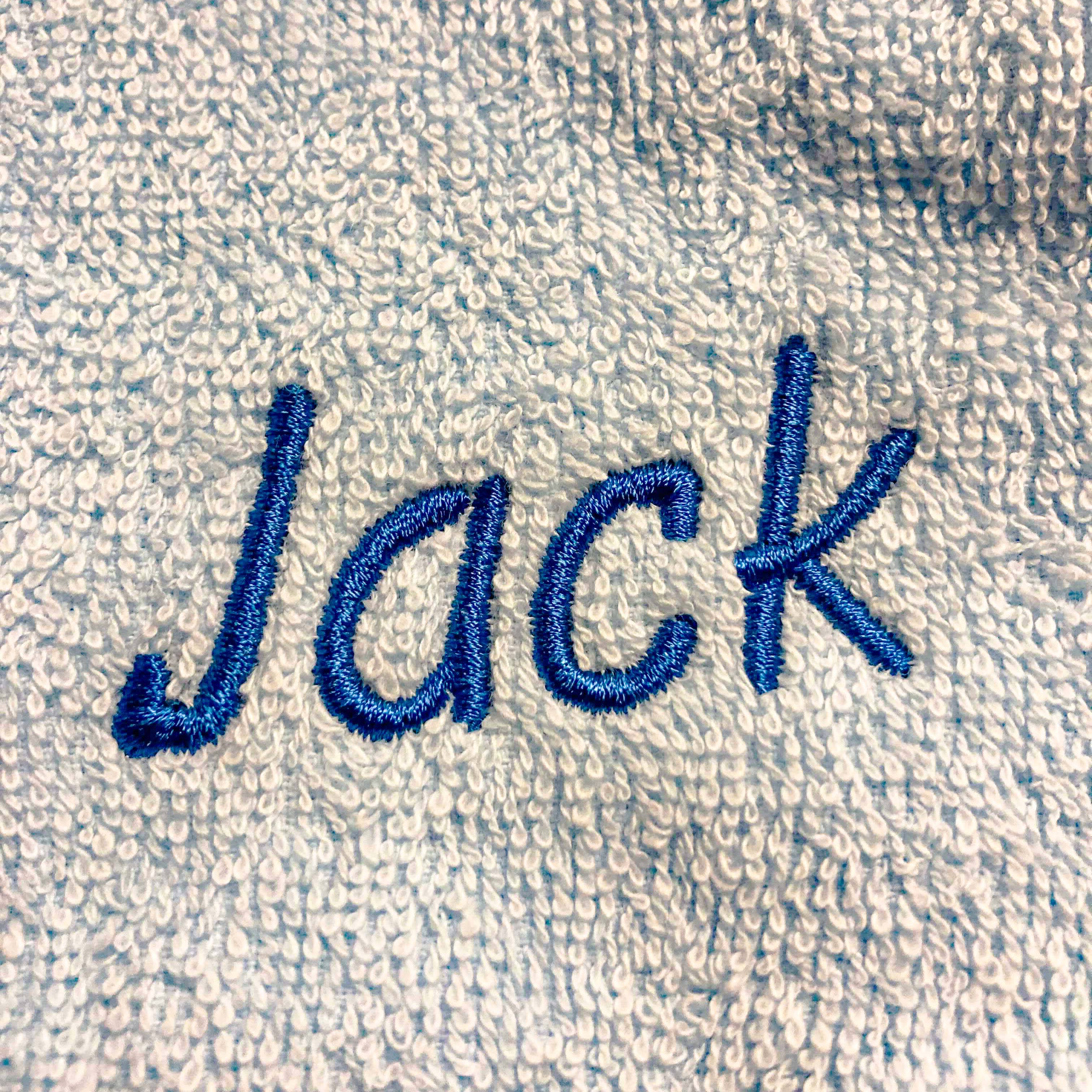 Embroidered with the child's name on the front left breast with rich viscose thread.