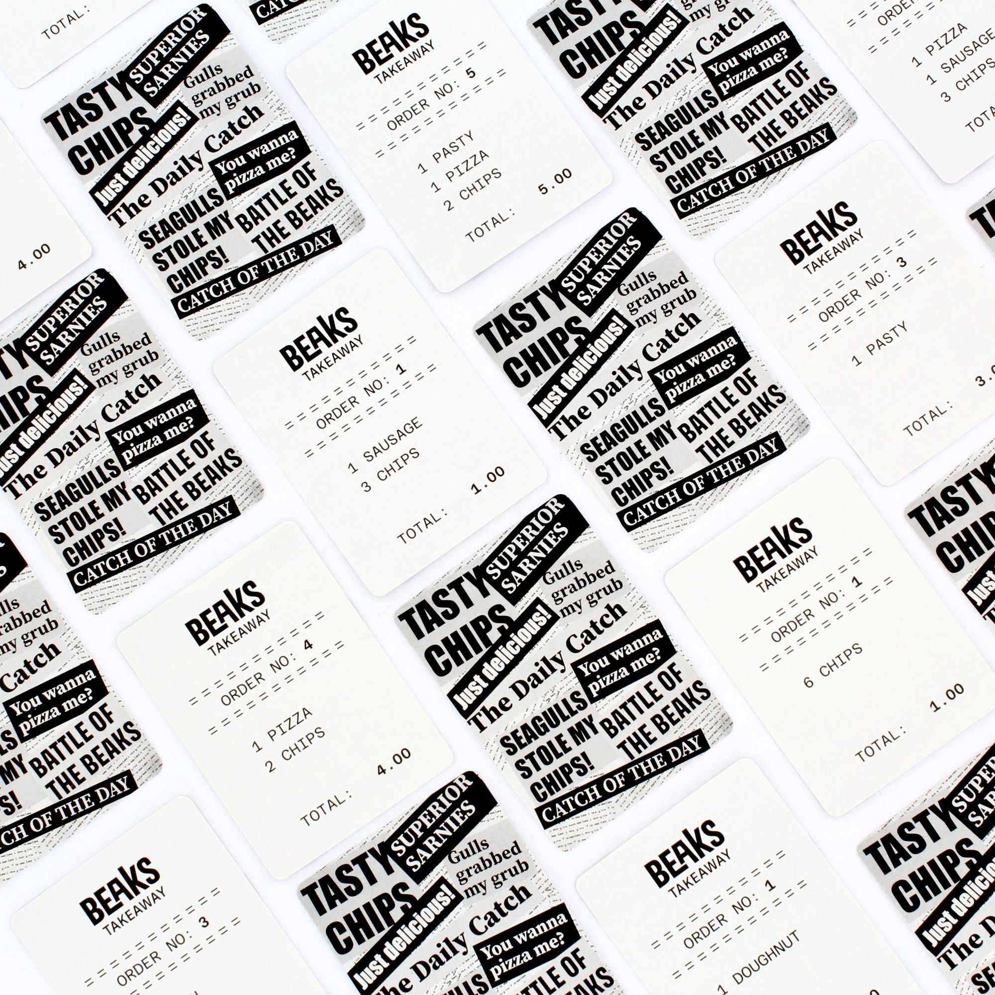 Players act as hungry seagulls competing to complete takeaway orders. Food items are placed in a pile at the centre of the table, and food order cards are arranged face-up around it. When the clock starts, everyone scrambles to use their tweezer “beaks” to grab the exact food pieces needed to match an order card. The first to complete a card, squawks loud and proud, winning the points and the card! Collect 10 points first to win the game.