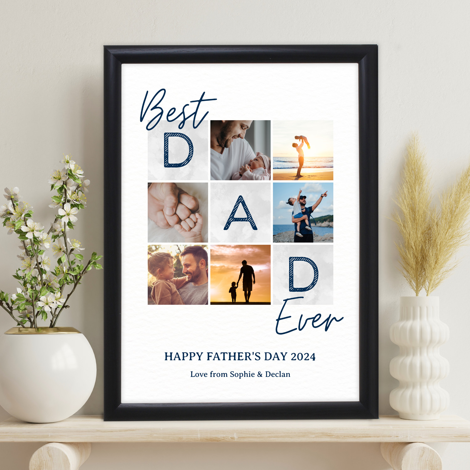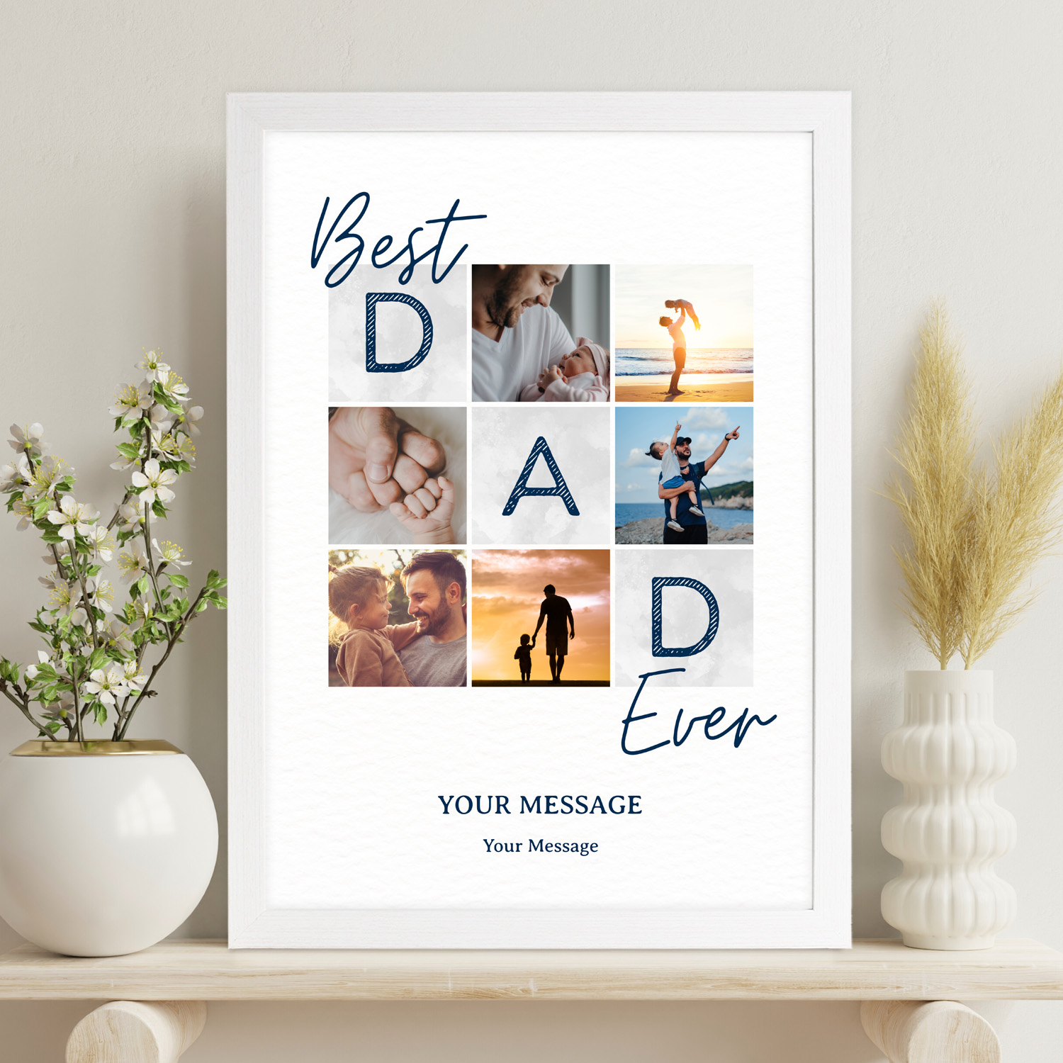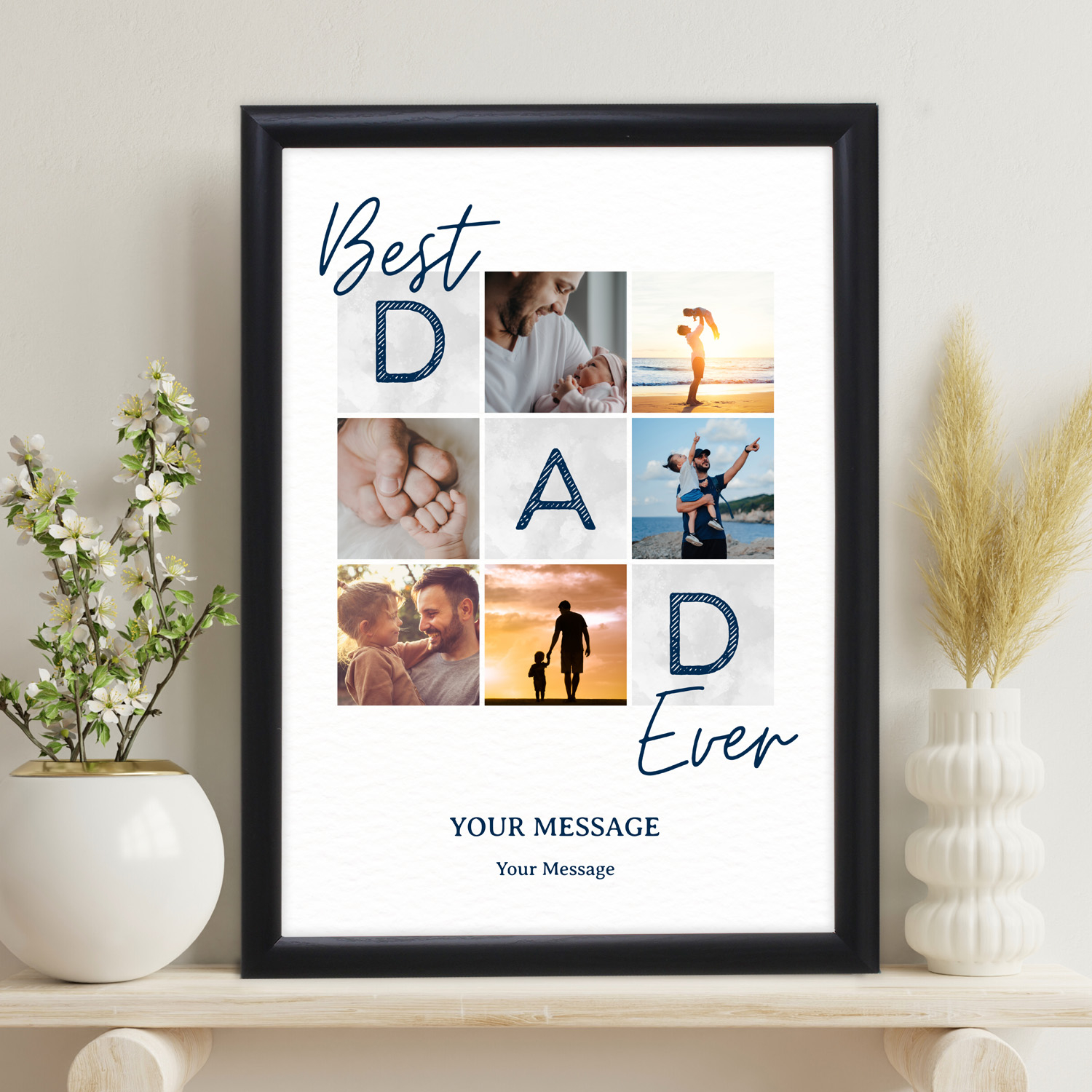 "Father's Day Best Dad Ever - Personalised Poster" offers a heartfelt gift idea for celebrating special occasions like Father's Day, your dad's birthday, or any memorable moment. Customise this poster with 6 cherished photos, along with a personal title and message, creating a truly unique and meaningful present.