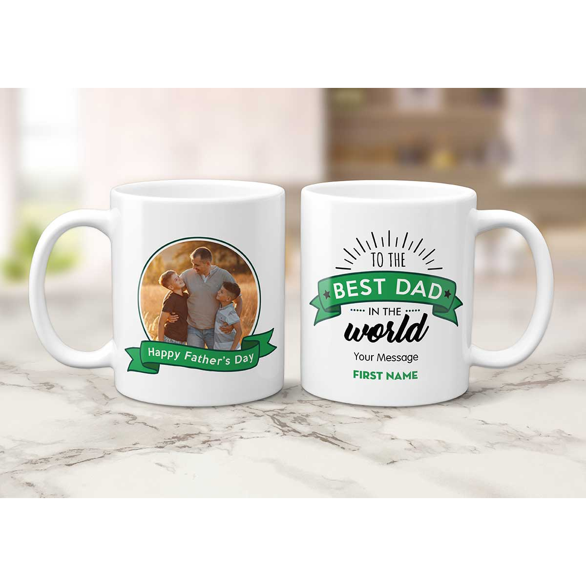 The mug is personalised with your photo and message as illustrated.