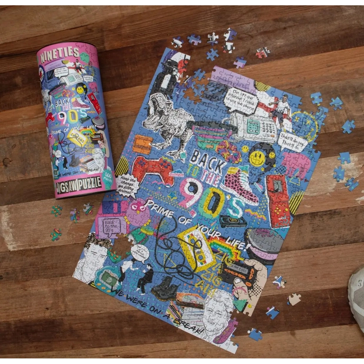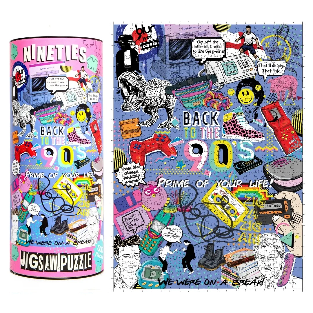 - BACK TO THE 90s – This 500 piece jigsaw comes packed full of images sure to flood your memory of events from this iconic decade! From scrunchies to slinkies, Blur to bumbags, this nostalgic puzzle is perfect for anyone obsessed with this legendary decade!