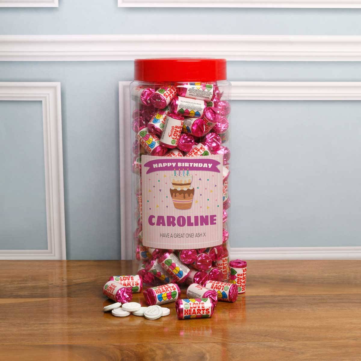 Packed full of Love Heart sweets, the jar's label is personalised with your recipient's name and your greeting.