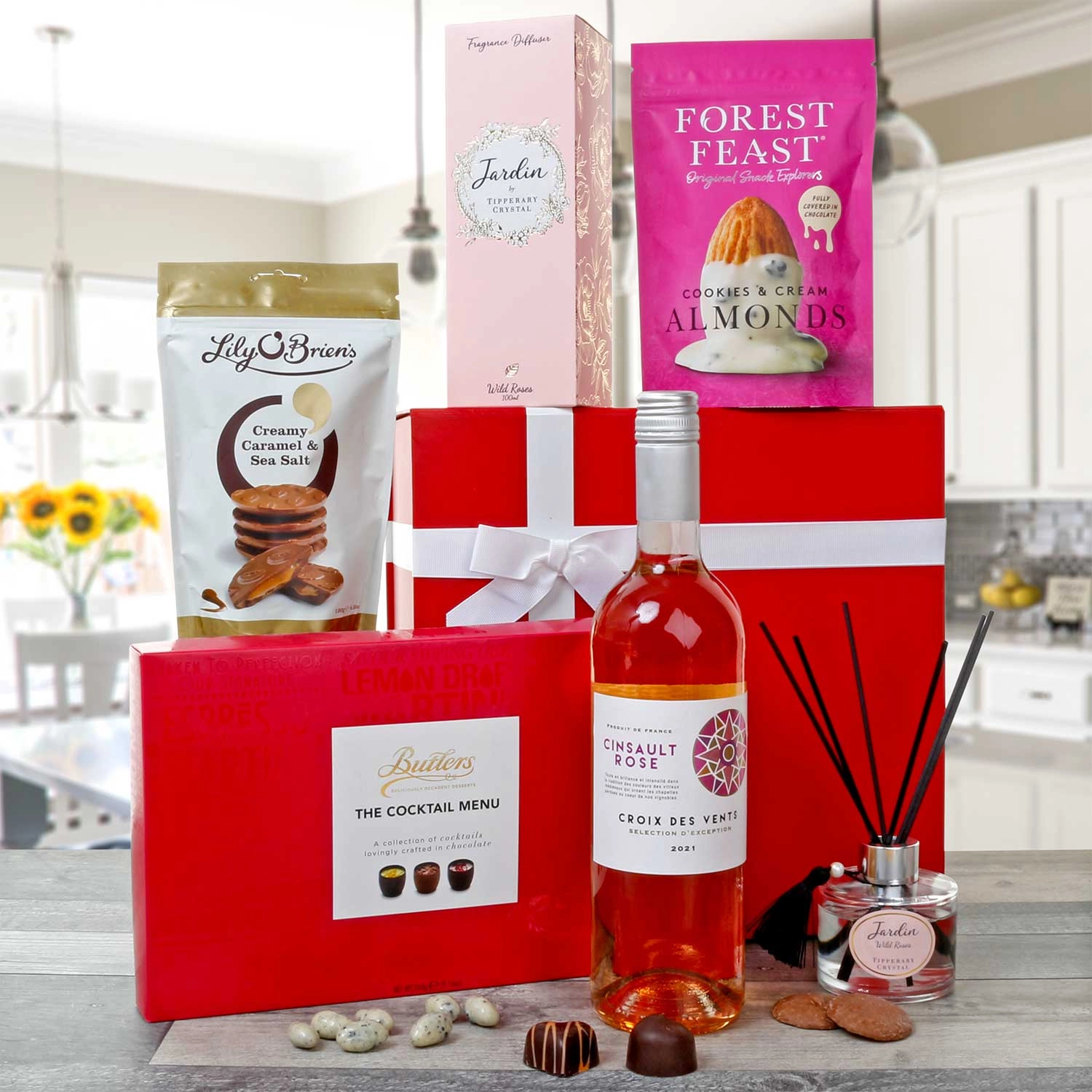 This beautifully curated hamper features a bottle of Cava Blush Cava Rose with a luxurious selection of chocolate sweet delights, perfect for celebrating special moments.