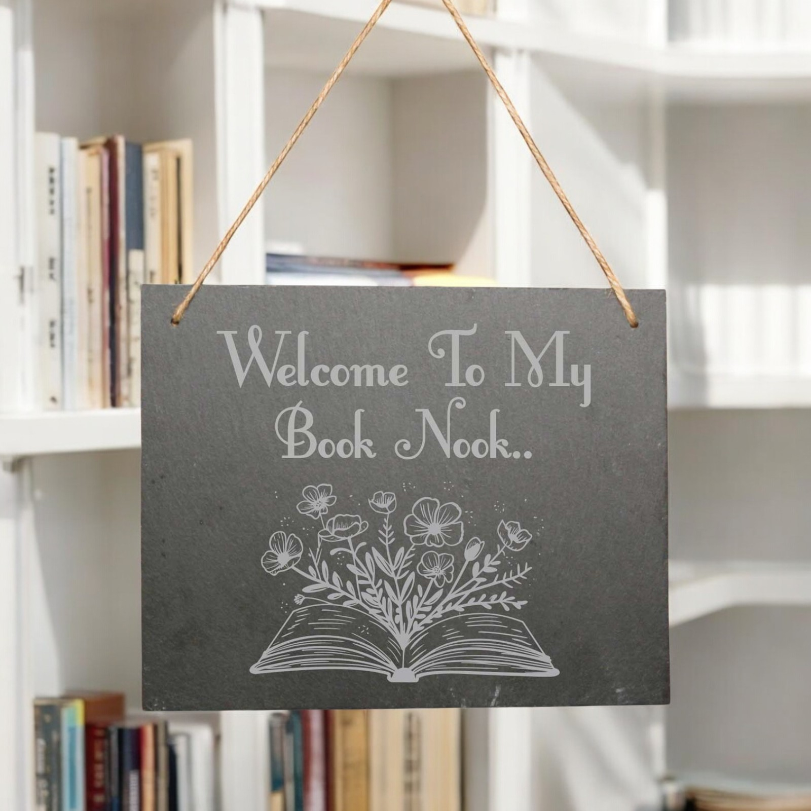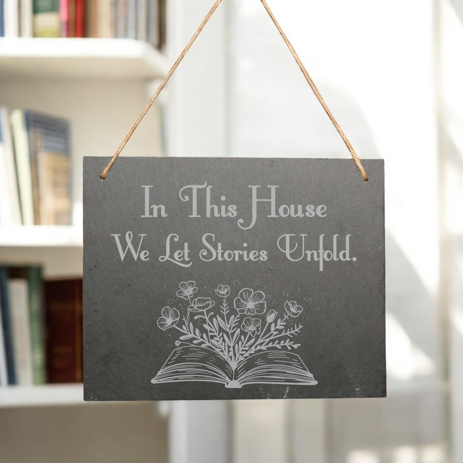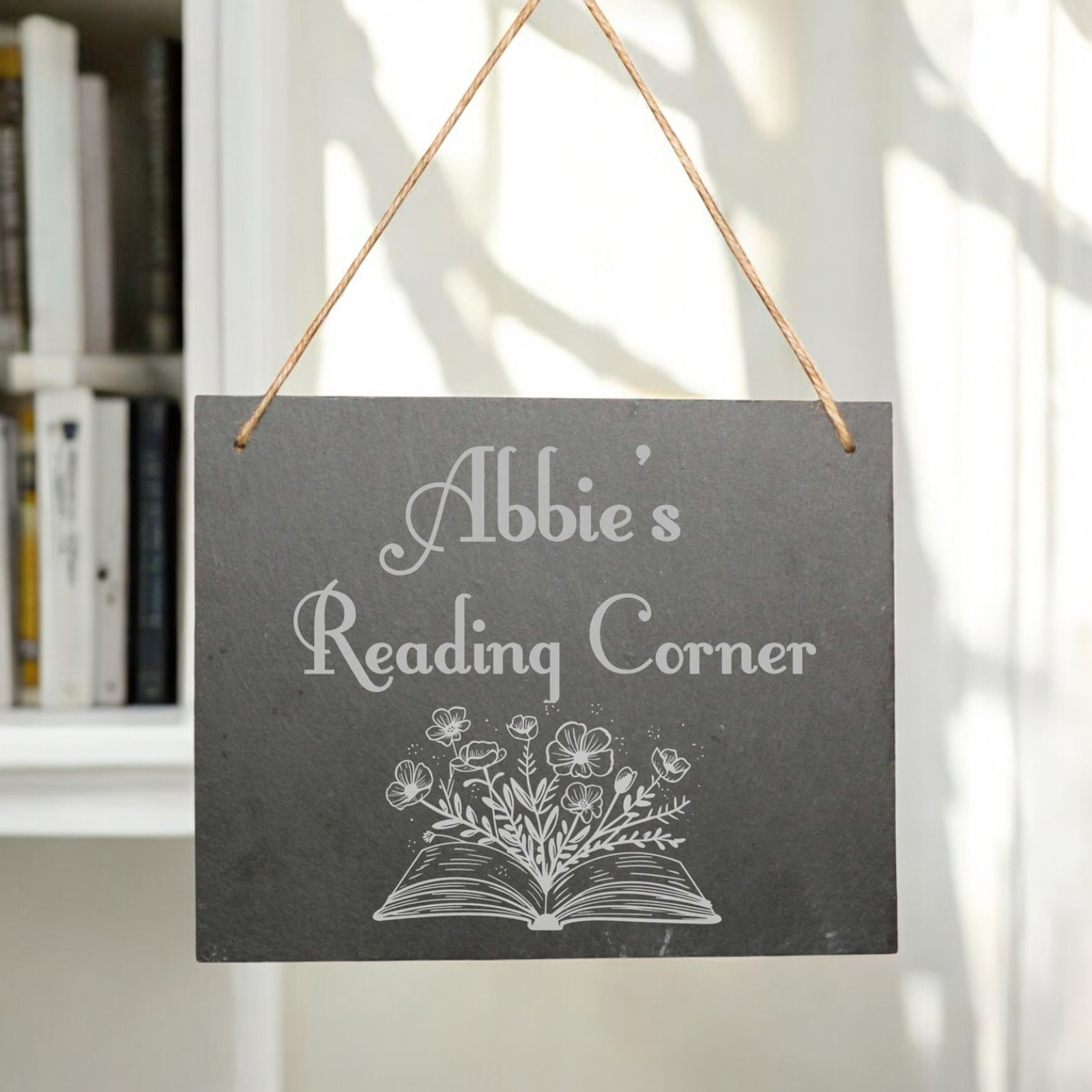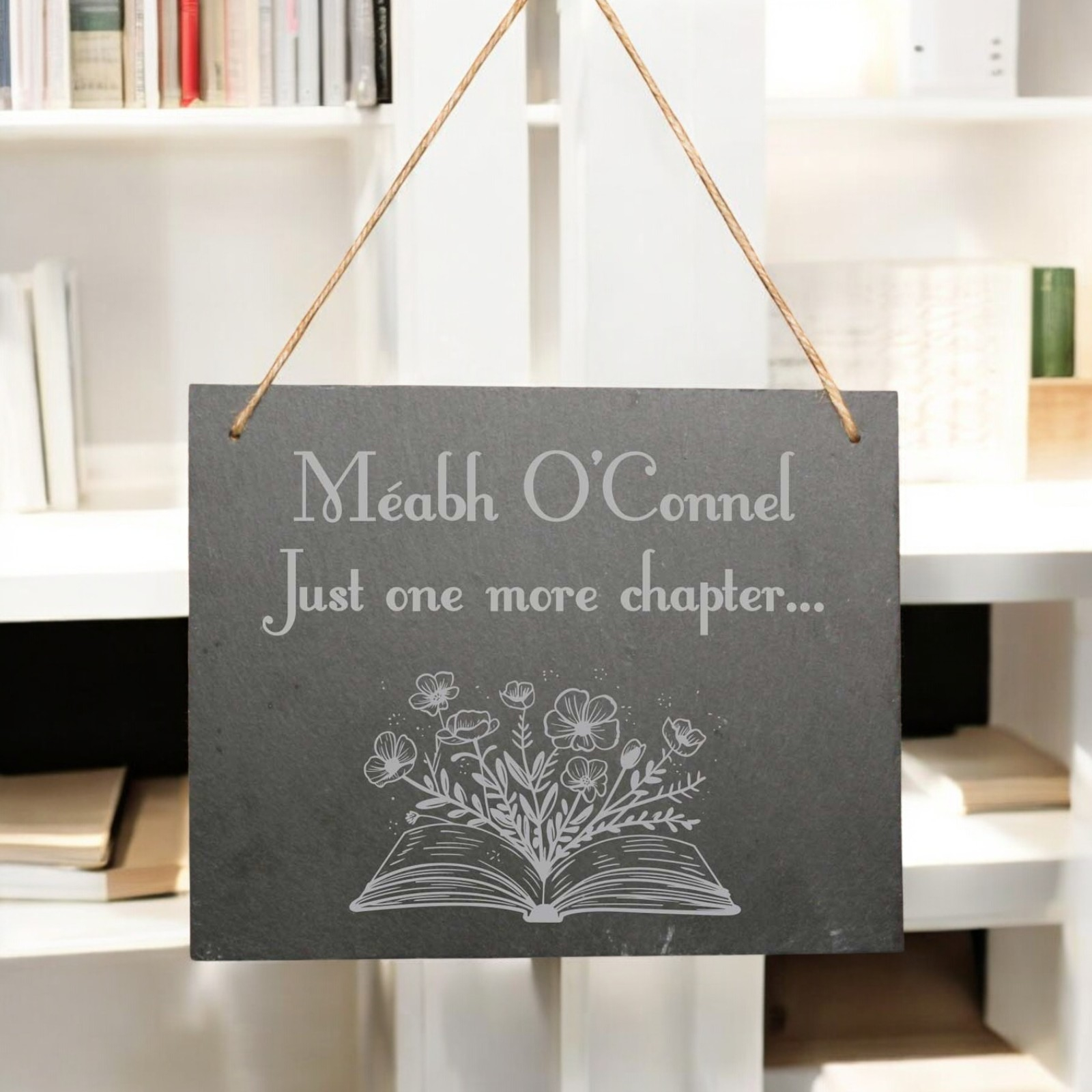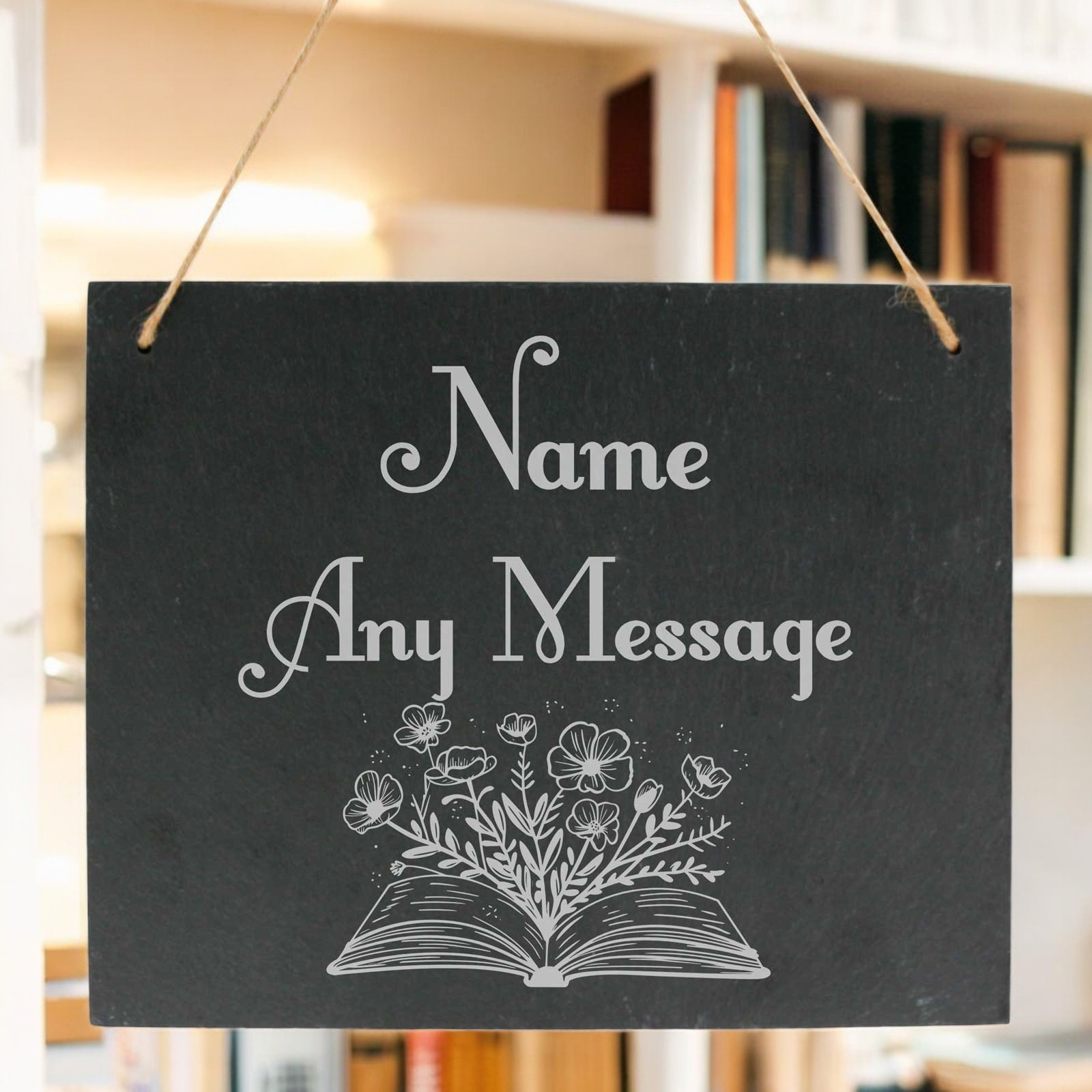 This is a personalised slate hanging sign designed for book lovers.