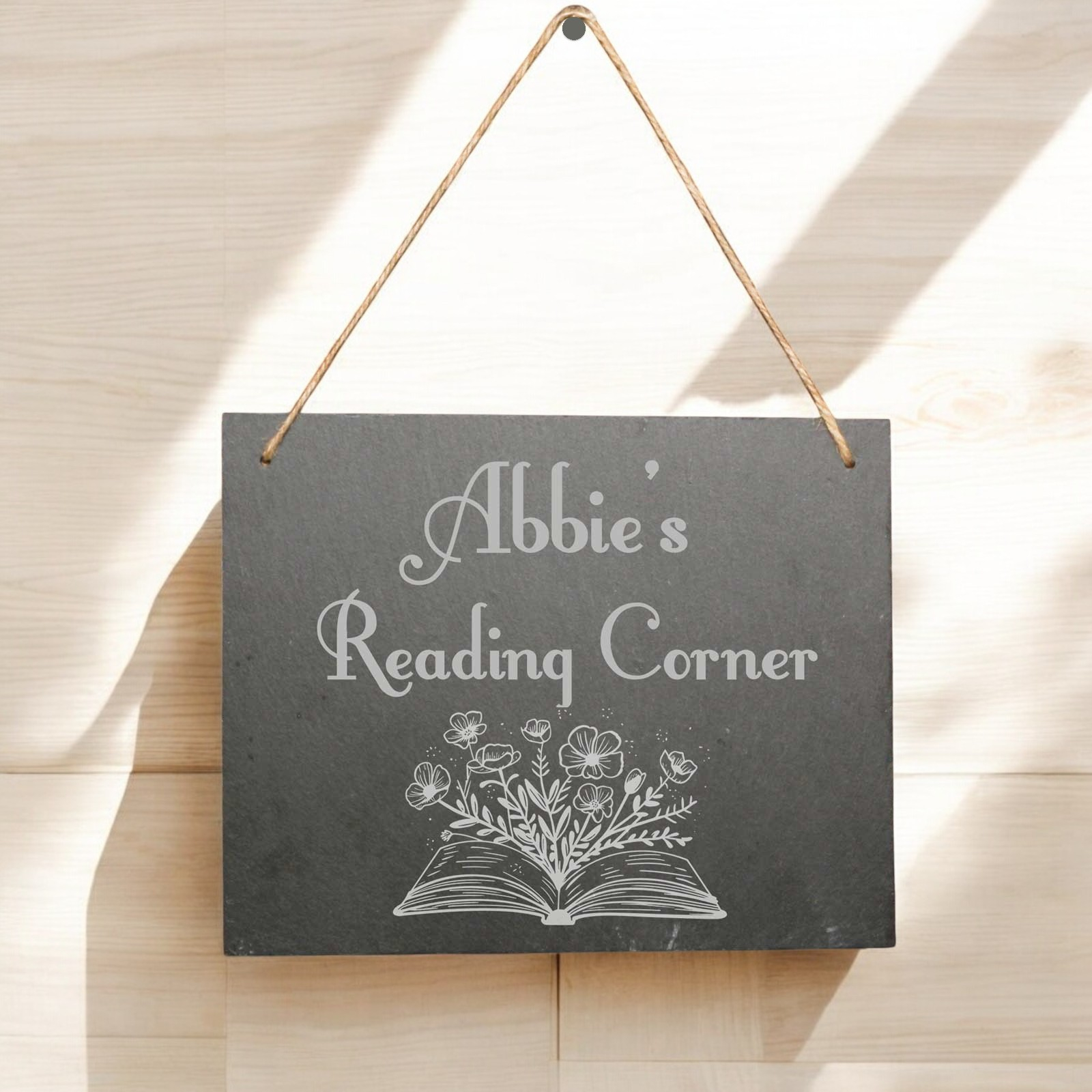 This is a personalised slate hanging sign designed for book lovers.