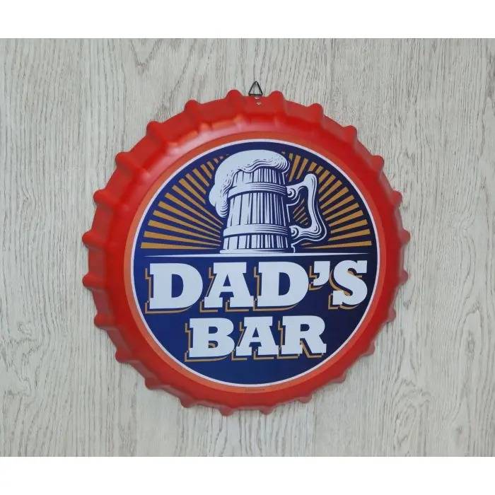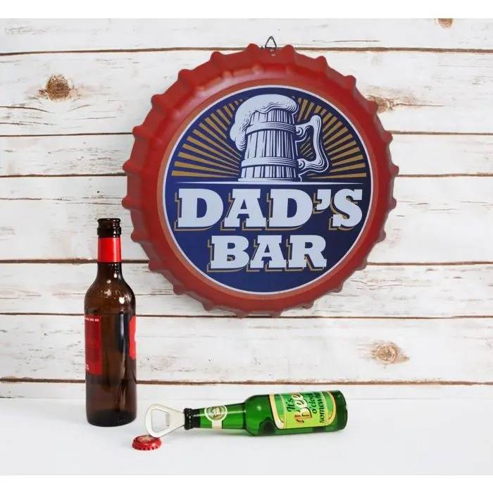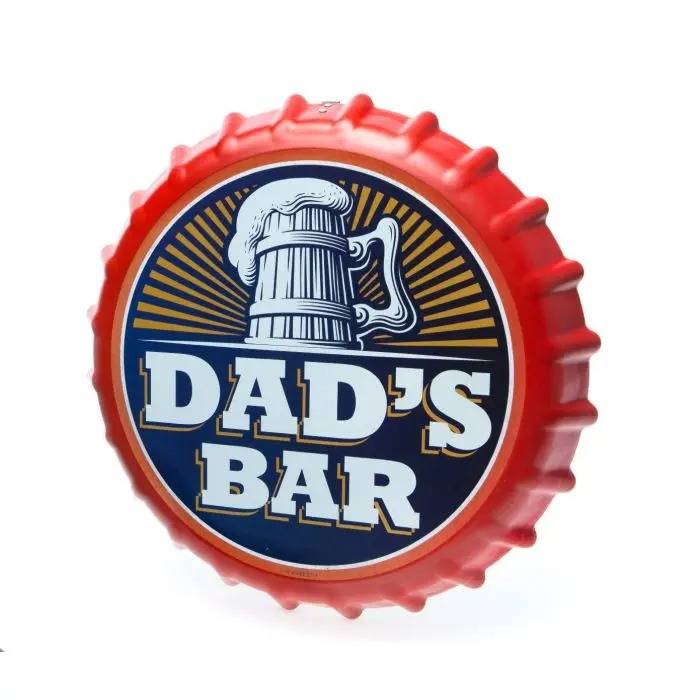 Is your dad someone who likes to sit down with a nice beer at the end of the day? Show him your appreciation with this brilliantly giant novelty bottle top. Unique and bright detail, With text that reads "Dad's Bar", This large bottle-top wall sign will sit perfectly in his man-cave or garage. This metal sign is lightweight and comes with a descreet metal loop so it can be hung easily on the wall. A wonderful beer themed gift for a special dad on his birthday, father's day or at Christmas.