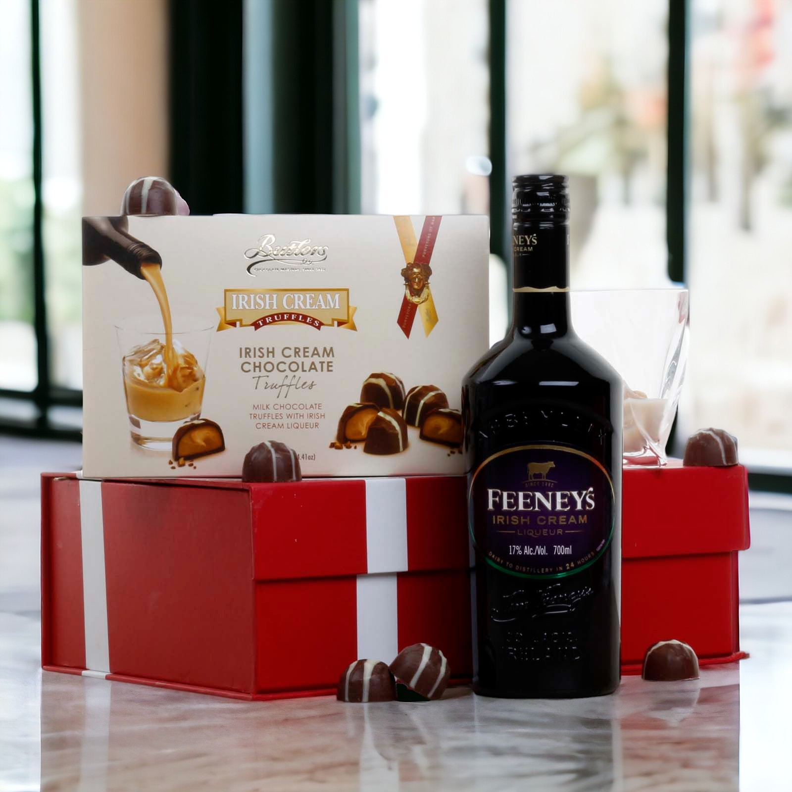 A simple yet classic combination of Irish Cream Liqueur and Butlers Irish Cream Chocolate Truffles.