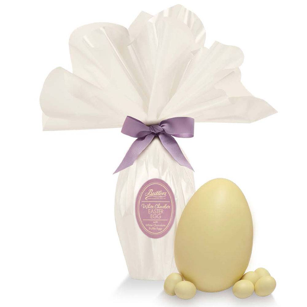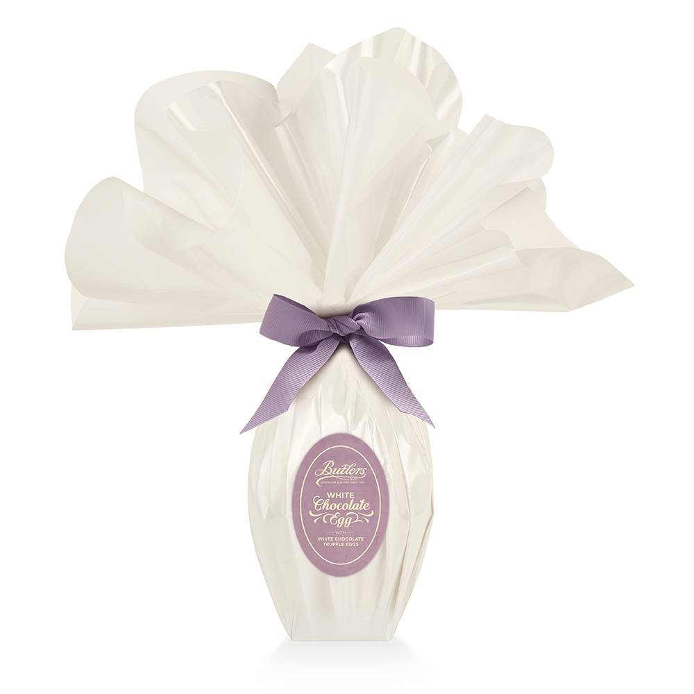 Wrapped in a delicate pearlised cream pastels and tied with a lavender bow, these eggs include a white chocolate egg and a selection of mini filled eggs.