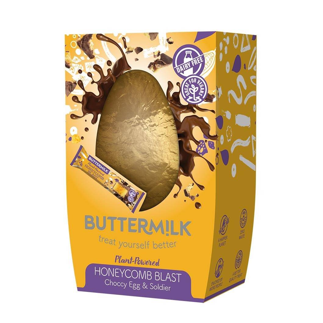 Generously thick plant-powered choccy egg with crunchy fragments of honeycomb, plus a bar of honeycomb enrobed in plant-powered choccy.