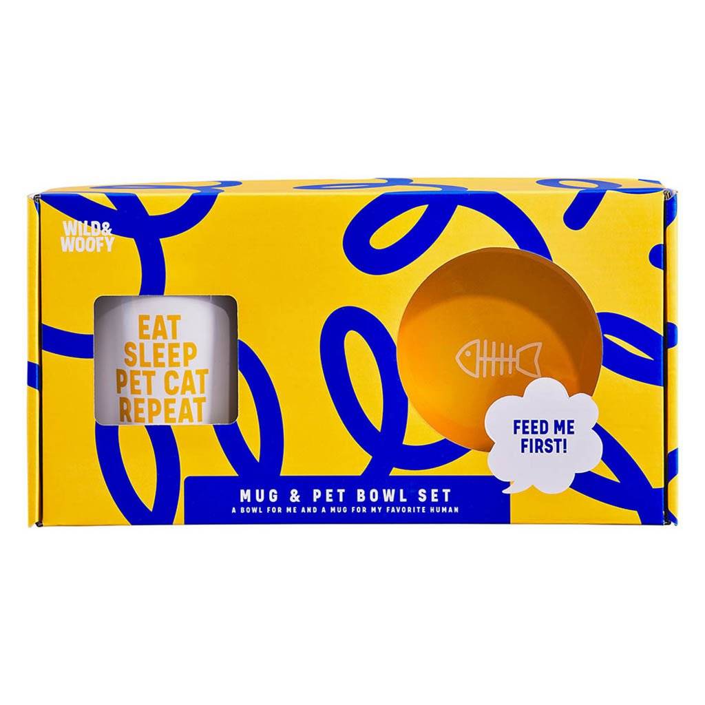 The ceramic mug reads 'Eat Sleep Pet Cat Repeat' and the food bowl reads 'Feed Me First' with a fish bone decal on the inside to make you smile.