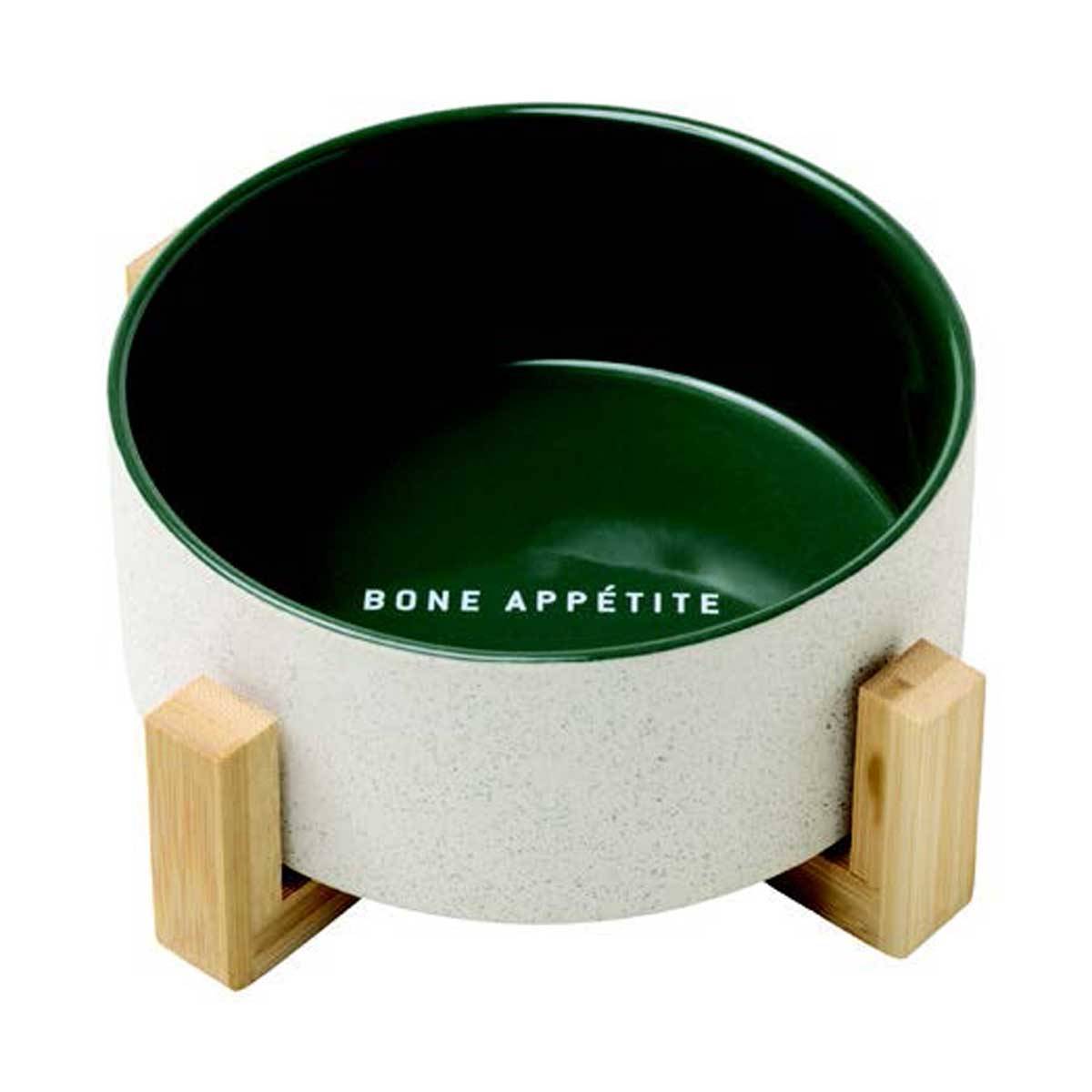 Your dog can eat in style with our Ceramic Dog Bowls with bamboo stand - cream speckled matte exterior and green gloss interior with decal.
